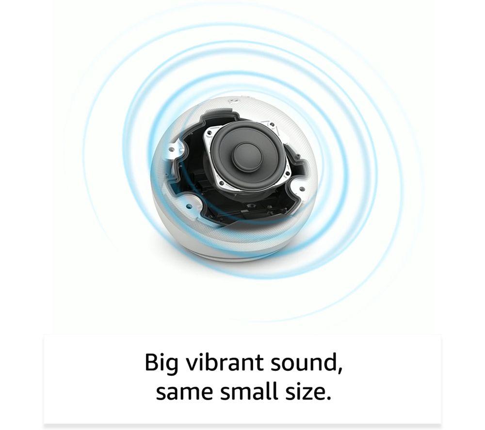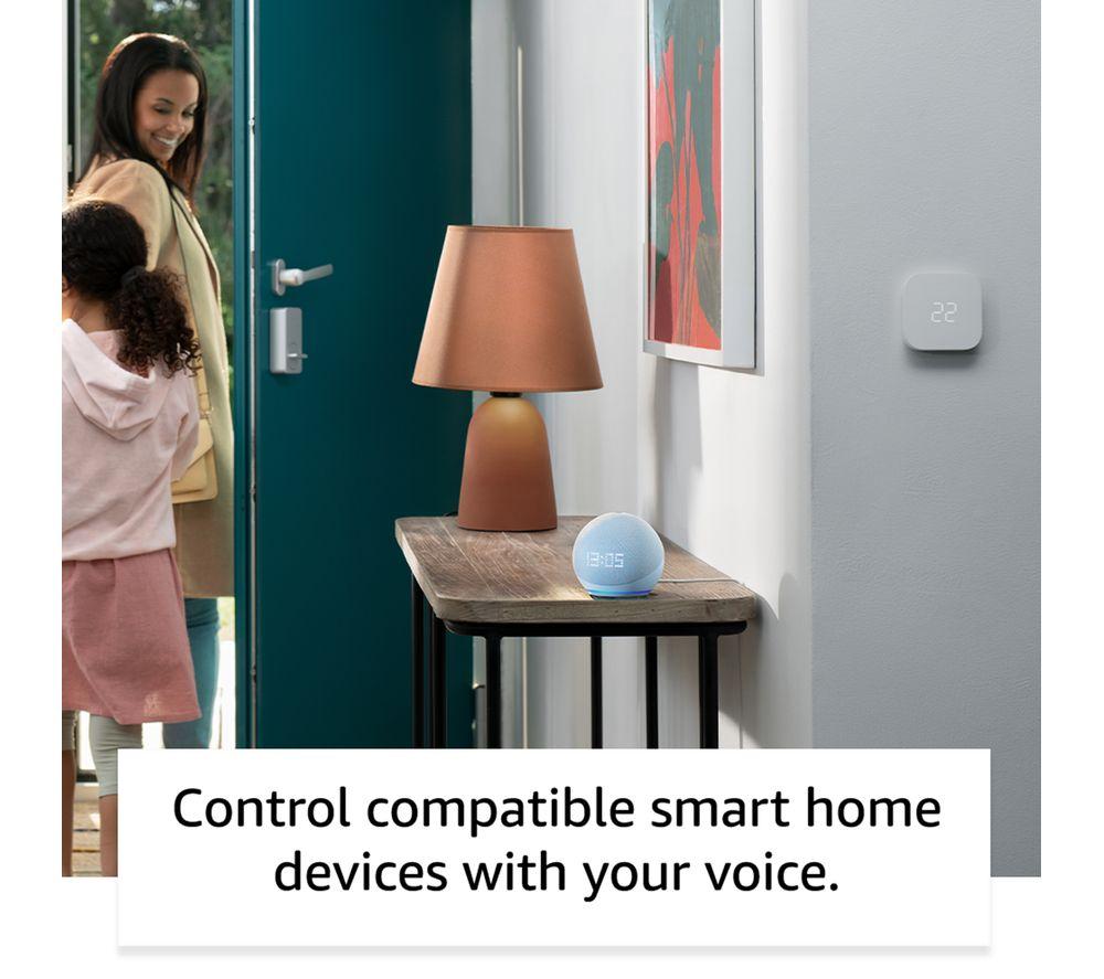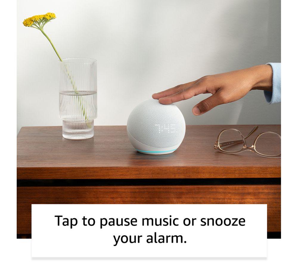 “Alexa, show me Amazon's best-sounding Echo Dot yet”. Meet the 5th generation of the Amazon Echo Dot with clock. It's the same dinky size as the 4th gen, but Amazon have packed in a larger driver, so it sounds louder than ever. Wake up to the radio or music and podcasts from the likes of Amazon Music, Spotify, and BBC Sounds. It's the perfect bedside table companion thanks to the LED display. It can show you the time, alarms, weather, song titles, and more. Alexa, the built-in voice assistant, is always happy to help – no matter how trivial. Get weather updates before you head out the door, add something to your shopping list mid-way through cooking, or set a reminder to get the kids' PE kit together. Alexa can even tell you a joke (laughs not guaranteed). It can help with the smart stuff around your home too. The built-in temperature sensor will tell your smart thermostat when to tweak the heating, you can set routines to switch on things like smart lights, and of course you can ask Alexa.Good to know- Tap controls make it easy to pause music, end calls, or snooze alarms- Can be paired with other Echo devices or Fire TV for multi-room music or to boost your TV sound- Personalise your Alexa Privacy settings on the app or by asking Alexa – there's a mic-off button too- It's super simple to setup – just plug in and use the Alexa app to connect to WiFi and get started- As part of a drive to reduce waste, 55% of the plastic parts and 95% of the fabric used is from post-consumer recycled materials- WiFi need a boost? If you've got an eero router you can use your Echo speaker as a WiFi extender