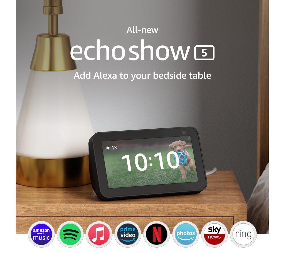 See more and do more with Amazon's 2nd Gen Echo Show 5. Alexa voice assistant is built-in, so all you need to do is ask. Add it on your bedside table and start your day with a routine that includes news and weather updates at a glance, turning on smart lights, and playing your favourite music. Or place it on your kitchen counter to view recipes, add to your shopping list, and set timers. Someone at the front door? It works with lots of smart doorbells and cameras, so you can see who's calling. Talking of calls – you can use the built-in camera for video chats with friends and family who have an Echo device or the Alexa app. And when you want to be entertained—you guessed it! Ask Alexa to play TV shows or films from Prime Video, Netflix and more, or music from Amazon Music, Spotify, and others.Good to know- It can be paired with other Echo devices for multi-room music- Alexa has tens of thousands of skills and counting - just say “Alexa, help me get started with skills”- You can display photos from Amazon Photos or Facebook on the home screen- Personalise your Alexa Privacy settings on the app or by asking Alexa – there's a mic-off button and built-in camera cover too- Parental controls make it safe for the whole family to use it – little ones can learn and have fun with Amazon Kids+ (subscription required)- It's super simple to set up – just plug in and use the Alexa app to connect to WiFi and get started- Designed with sustainability in mind, it's made from 30% post-consumer recycled plastics, 100% post-consumer recycled fabric, and 100% recycled die-cast aluminium