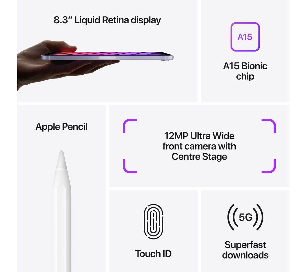 Edge-to-edge Liquid Retina display With a stunning all-screen design, Apple iPad mini gives you more room to watch, work and create. The edge-to-edge Liquid Retina display brings content to life with vivid colours and sharp text, while ultra-low reflectivity lets you work from anywhere. Handwrite notes, doodle and sketch with the 2nd generation Apple Pencil (sold separately). It attaches magnetically to the side of iPad mini, ready for when creativity strikes. Powerful and portable From complex editing software to demanding graphic-intensive games, the A15 Bionic chip provides plenty of power for work and play. Delivering up to a 40% faster performance than the previous iPad mini, there's nothing holding you back. And with up to 10 hours of battery life, you can surf and stream all-day long. 5G connectivityNo more waiting for videos to buffer. With ultra-fast 5G speeds, stream movies or video call your friends from wherever you are.\nUltra-wide camera fits everything in\n Your FaceTime calls just levelled up. Using the 12 MP Ultra Wide camera and machine learning, Centre Stage keeps you in the centre of frame as you move around. So the focus is always on you - even if you're on the go. Touch ID Unlock your iPad mini or securely make a payment with the integrated Touch ID button. It provides advanced security for everything you do. Use Apple Pay or download apps just using your fingerprint.\n_______________________________________________ Please note: Apple Pencil sold separately.