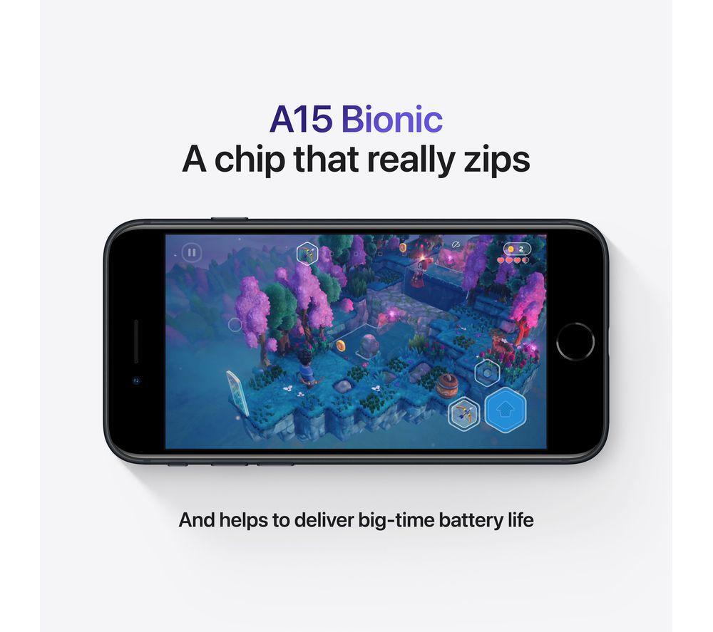 With a super-powerful A15 Bionic chip, brilliant low-light photo technology like Deep Fusion and intuitive iOS 15, Apple iPhone SE has everything you love, and more.\nWhat we love- With the same powerful A15 Bionic chip that's in the iPhone 13, iPhone SE loads apps in a flash, delivers stunningly smooth graphics and even unlocks advanced photography modes so everything looks fantastic- Photos look great thanks to Smart HDR 4 that delivers realistic lighting, contrast and skintones. It works for up to 4 people in a photo, so everyone can look stunning- Deep Fusion brings pixel-perfect texture and detail to life by examining multiple exposures for subtle details in mid to low light- Photographic Styles let you choose a look to add to your photos – choose from settings like Warm or Cool to adjust your photos while keeping them looking natural- The enhanced video mode captures loads of detail in your videos, even in dimmer conditions – you won't miss a thing- iOS 15 is the perfect partner for your iPhone SE. It's got everything you love, and lets you simply and securely send emails, make calls and much moreGood to know- All the tech works together for a longer battery life, so you can do more, for longer- The durable water resistant design and tough glass means that your iPhone is built for almost anything- The Retina HD display makes everything look amazing, whether it's apps, calls or photos- Unlock your phone securely with the Touch ID on the Home button – you can even use it with Apple Pay- It's kinder to the environment too – it uses 100% recycled rare earth elements for the magnets and engine