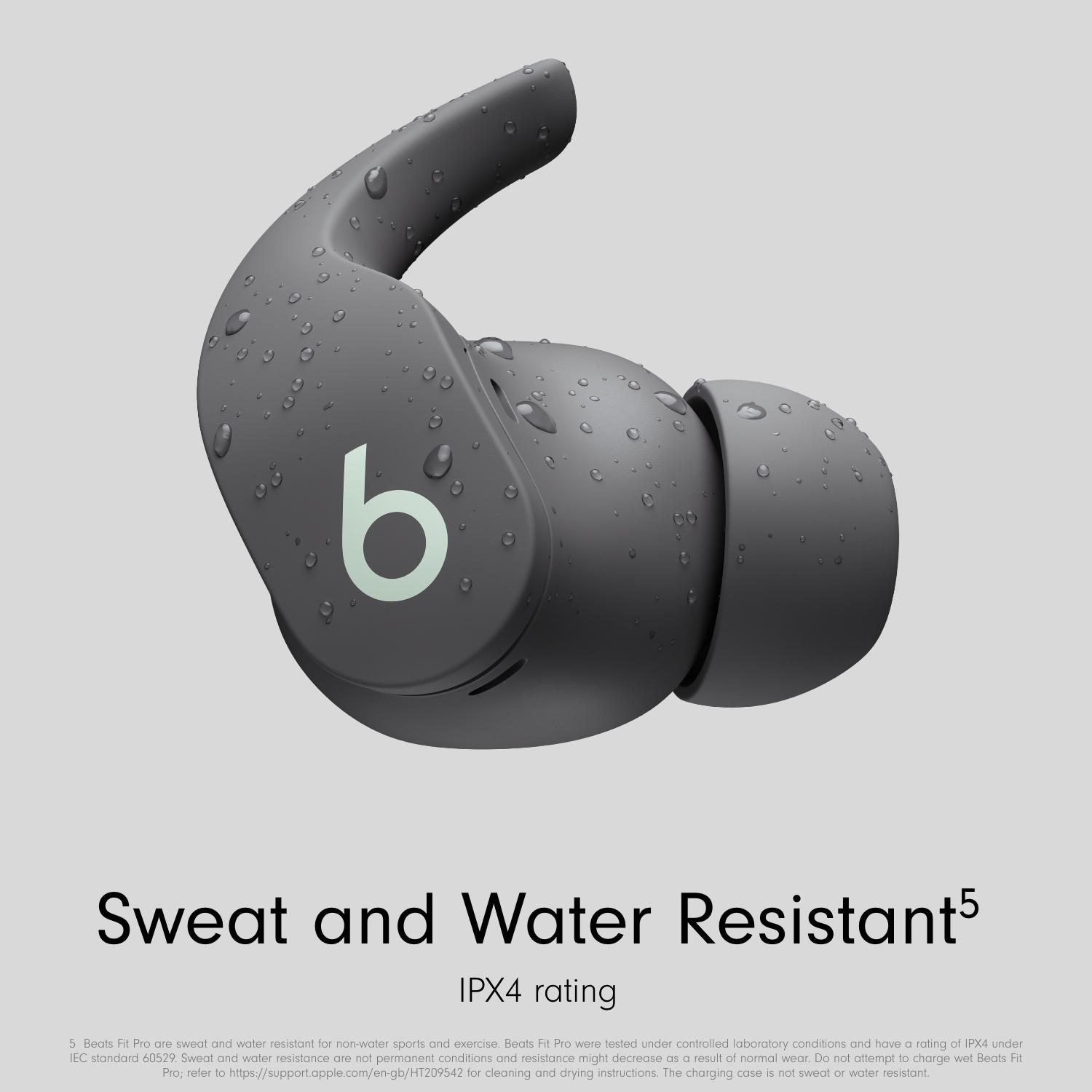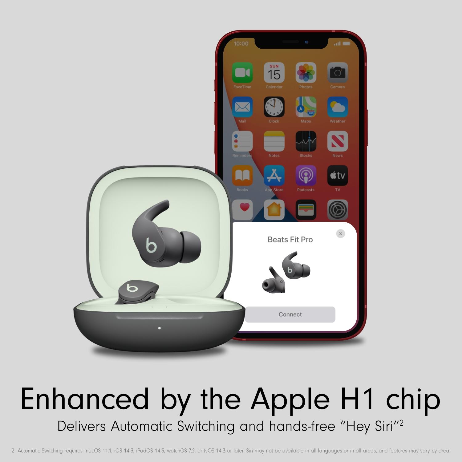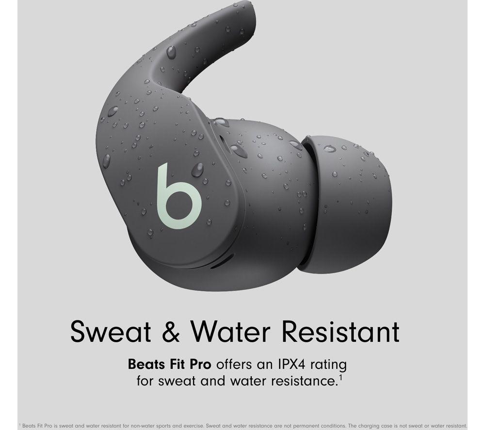 These Beats Fit Pro earbuds are the perfect companion for your active lifestyle. Music, videos, and games feel super immersive thanks to Spatial Audio with dynamic head tracking – it adjusts the sound as you turn your head, giving you the feeling of being at a concert. The flexible secure-fit wingtips are flexible will stay put during even the most intense workouts. Dive into your favourite playlists and podcasts undisturbed with active noise-cancelling which blocks out your surroundings. And when you need to listen out for your platform announcement, switch to Transparency mode to let the outside world in.Good to know - They're powered by the Apple H1 chip – effortlessly sync with all your Apple devices and go hands-free- They have 6 hours of listening time with 3 extra charges in the charging case- A 5-minute Fast Fuel charge will give you up to 1 hour of playback when you need a little extra juice – perfect for when you're heading out the door- You'll always be heard loud and clear on your calls thanks to dual beamforming mics which pinpoint your voice and cut out external noise and wind- The Beats app lets you manage one-touch pairing, customise the controls, check the battery levels and more.- On-device controls let you manage your music, toggle listening modes, take calls and active your voice assistant- The sweat and water-resistant design makes them perfect for workouts\n______________________________________________________Please note:- Compatible hardware and software required for Spatial Audio. Works with compatible content in supported apps. Not all content available in Dolby Atmos. Head tracking feature requires iPhone or iPad.- One-touch pairing requires an iCloud account and macOS Sierra, iOS 10, watchOS 3 or later versions.- Automatic Switching requires macOS 11.1, iOS 14.3, iPadOS 14.3, watchOS 7.2, or tvOS 14.3 or later.- Audio Sharing is compatible with Beats Fit Pro, Beats Flex, Solo Pro, Powerbeats Pro, Powerbeats, Solo3 Wireless, Powerbeats3 Wireless, Beats Studio3 Wireless, BeatsX, AirPods (1st generation or later), AirPods Pro and AirPods Max. Works with iPhone 8 or later and iPod touch (7th generation) with the latest version of iOS, and 12.9-inch iPad Pro (2nd generation or later), 11-inch iPad Pro, 10.5-inch iPad Pro, iPad (5th generation or later), iPad Air (3rd generation) and iPad mini (5th generation) with the latest version of iPadOS.