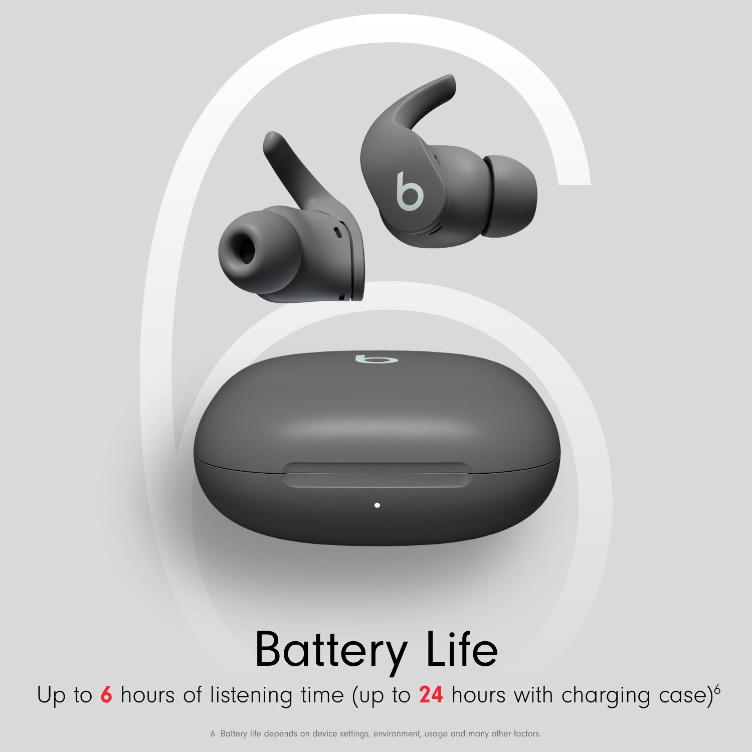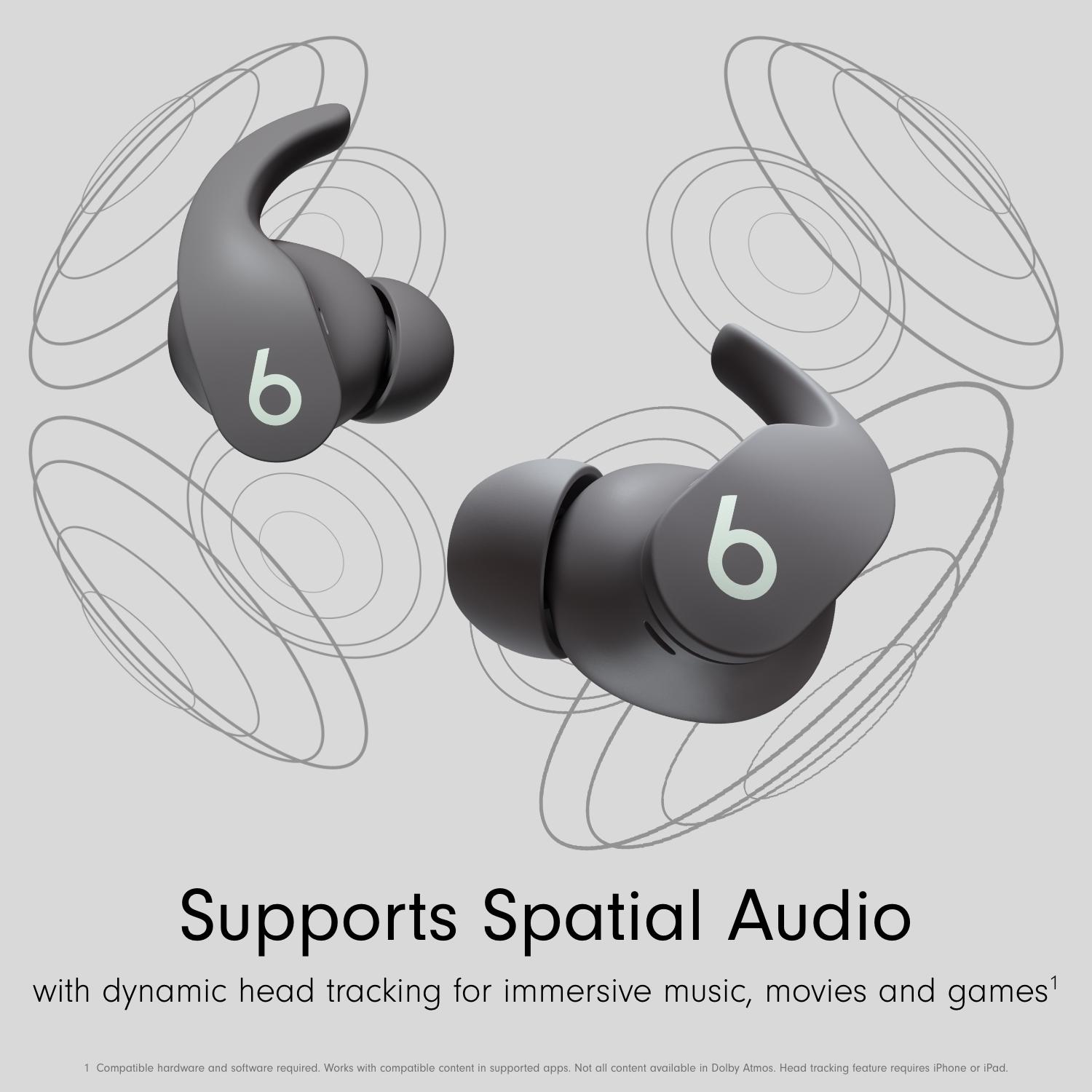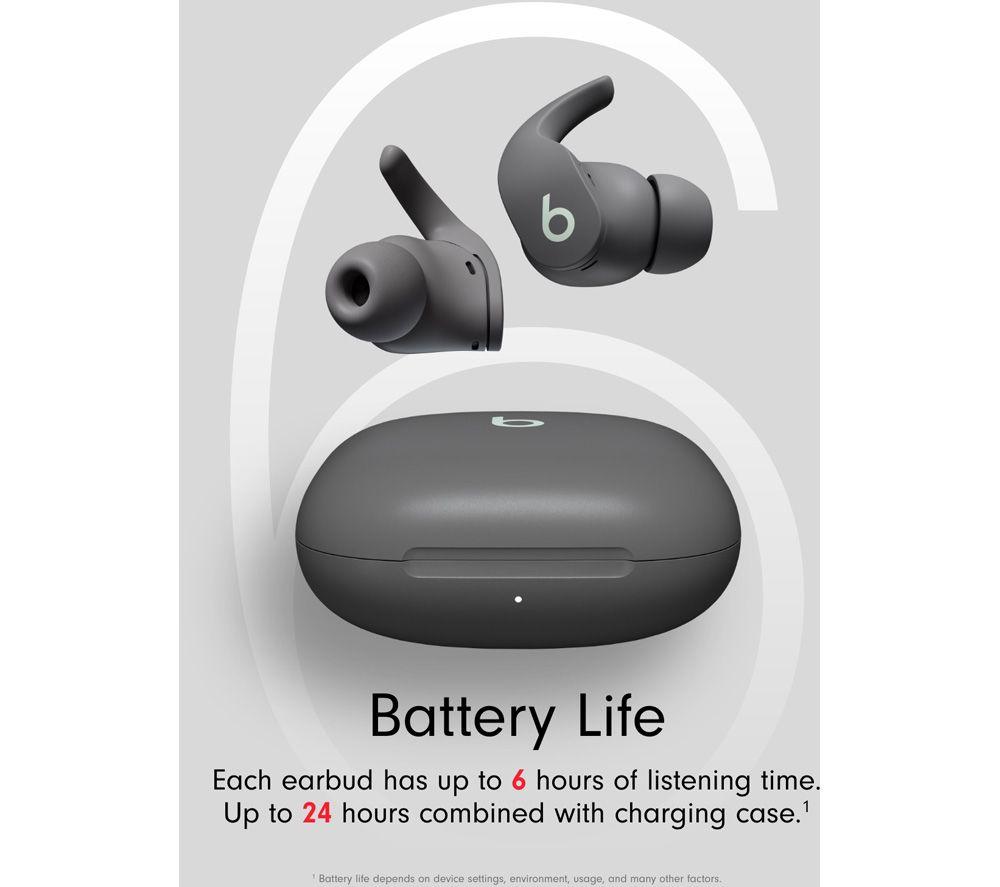 These Beats Fit Pro earbuds are the perfect companion for your active lifestyle. Music, videos, and games feel super immersive thanks to Spatial Audio with dynamic head tracking – it adjusts the sound as you turn your head, giving you the feeling of being at a concert. The flexible secure-fit wingtips are flexible will stay put during even the most intense workouts. Dive into your favourite playlists and podcasts undisturbed with active noise-cancelling which blocks out your surroundings. And when you need to listen out for your platform announcement, switch to Transparency mode to let the outside world in.Good to know - They're powered by the Apple H1 chip – effortlessly sync with all your Apple devices and go hands-free- They have 6 hours of listening time with 3 extra charges in the charging case- A 5-minute Fast Fuel charge will give you up to 1 hour of playback when you need a little extra juice – perfect for when you're heading out the door- You'll always be heard loud and clear on your calls thanks to dual beamforming mics which pinpoint your voice and cut out external noise and wind- The Beats app lets you manage one-touch pairing, customise the controls, check the battery levels and more.- On-device controls let you manage your music, toggle listening modes, take calls and active your voice assistant- The sweat and water-resistant design makes them perfect for workouts\n______________________________________________________Please note:- Compatible hardware and software required for Spatial Audio. Works with compatible content in supported apps. Not all content available in Dolby Atmos. Head tracking feature requires iPhone or iPad.- One-touch pairing requires an iCloud account and macOS Sierra, iOS 10, watchOS 3 or later versions.- Automatic Switching requires macOS 11.1, iOS 14.3, iPadOS 14.3, watchOS 7.2, or tvOS 14.3 or later.- Audio Sharing is compatible with Beats Fit Pro, Beats Flex, Solo Pro, Powerbeats Pro, Powerbeats, Solo3 Wireless, Powerbeats3 Wireless, Beats Studio3 Wireless, BeatsX, AirPods (1st generation or later), AirPods Pro and AirPods Max. Works with iPhone 8 or later and iPod touch (7th generation) with the latest version of iOS, and 12.9-inch iPad Pro (2nd generation or later), 11-inch iPad Pro, 10.5-inch iPad Pro, iPad (5th generation or later), iPad Air (3rd generation) and iPad mini (5th generation) with the latest version of iPadOS.