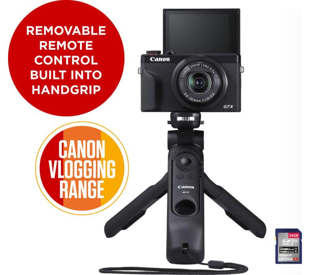 Vlogger KitWhether you're looking to upgrade the quality of videos on your channel or just getting started in the world of vlogging, this Canon PowerShot G7 X MK III Compact Camera Vlogging Kit has everything you need. In addition to the high performance PowerShot G7 X MK III Camera, this bundle includes a handy tripod grip for versatile indoor and outdoor shooting and a 64 GB SD memory card with fast read and write speeds.Skip the editing suiteKeep your followers updated – with the Canon PowerShot G7 X Mark III High Performance Compact Camera you can livestream or upload straight to YouTube. Shot in 4K without cropping or slow motion at up to 120 fps in Full HD.There's a flip-up touchscreen that makes vlogging and selfies super easy. Plus, you can use the app as a remote so no one is left out the group shot.Captivating contentSelfies, panoramas, time lapse videos – they're all packed with detail thanks to the 20.1-megapixel sensor.The zoom lens performs brilliantly in low light, perfect for vlogging about the city's restaurants and bars. You can capture a shallow depth of field for flattering portraits and instagrammable food shots.Shoot like a proThe G7 X MK III feels fast and familiar – you'll love the quick autofocus (AF) and 30 fps RAW burst mode that makes it easy to capture the best shot.