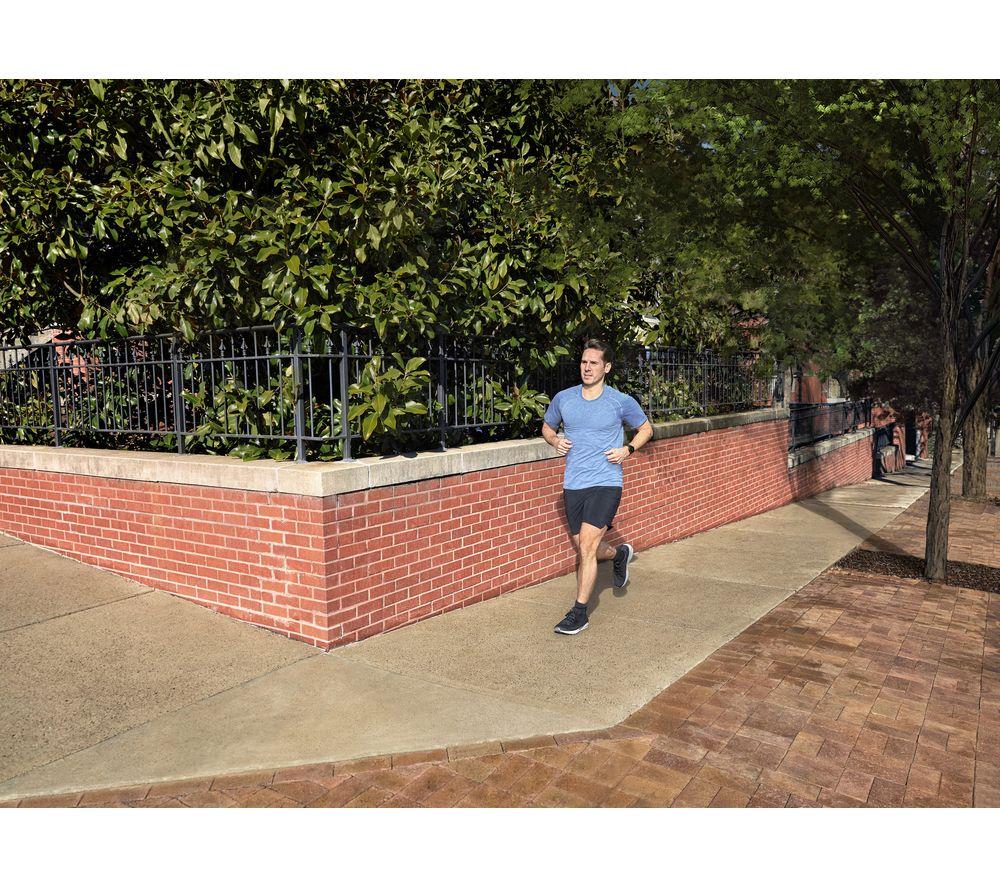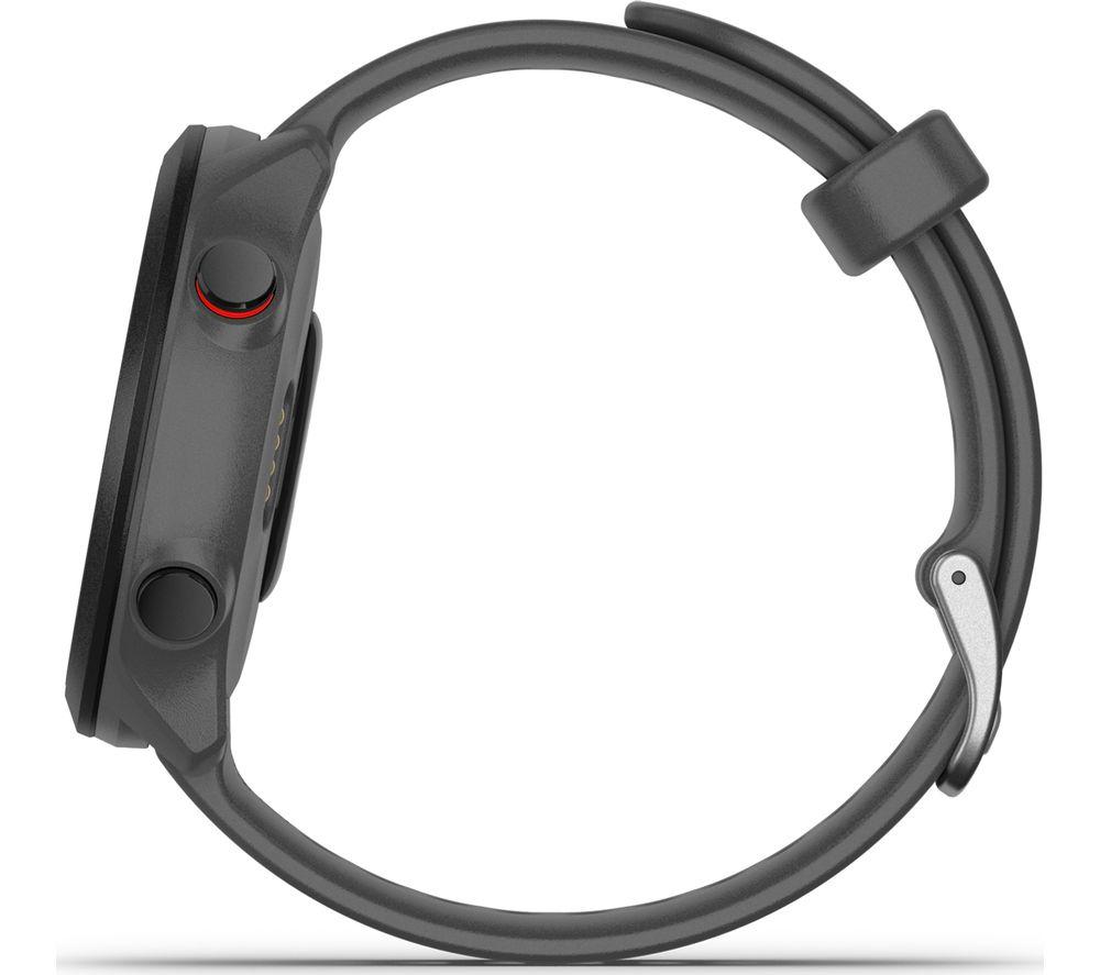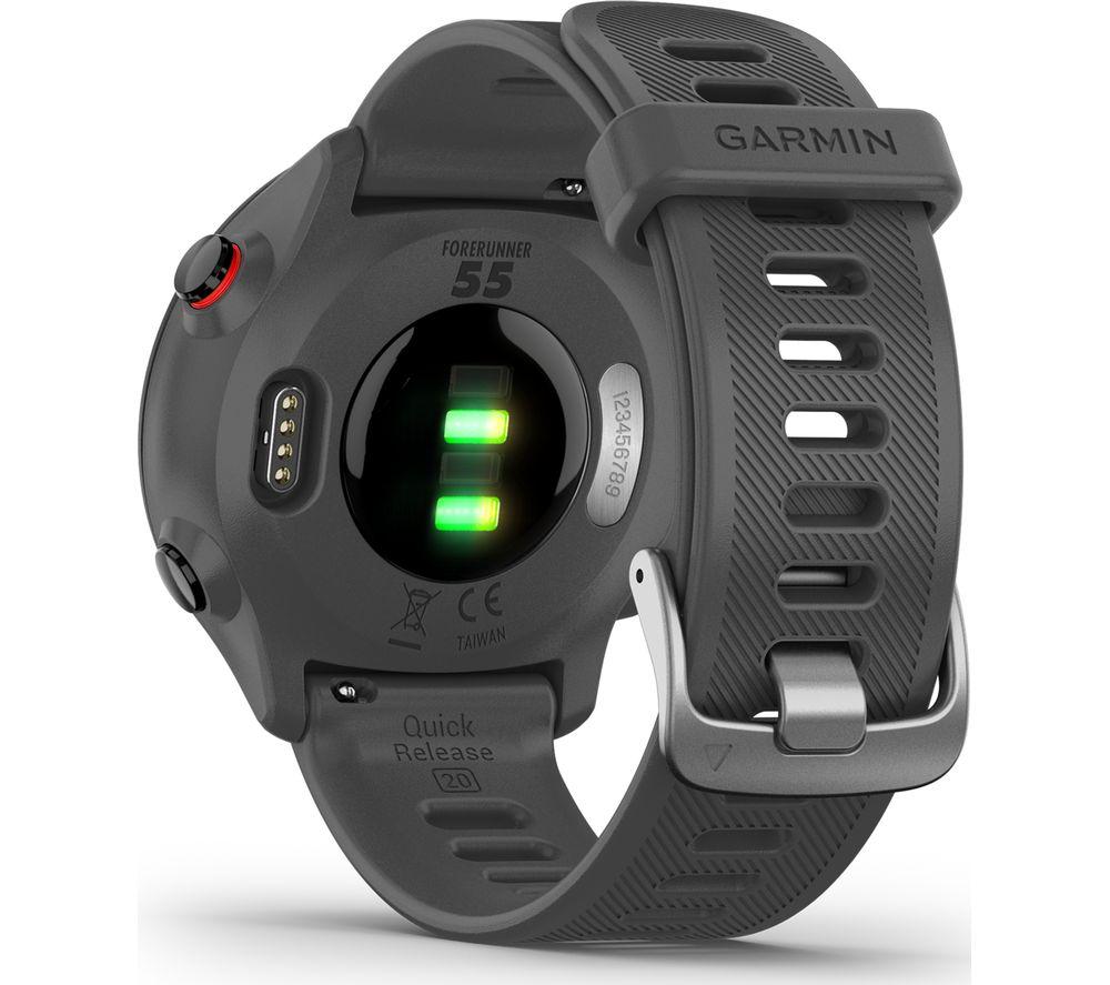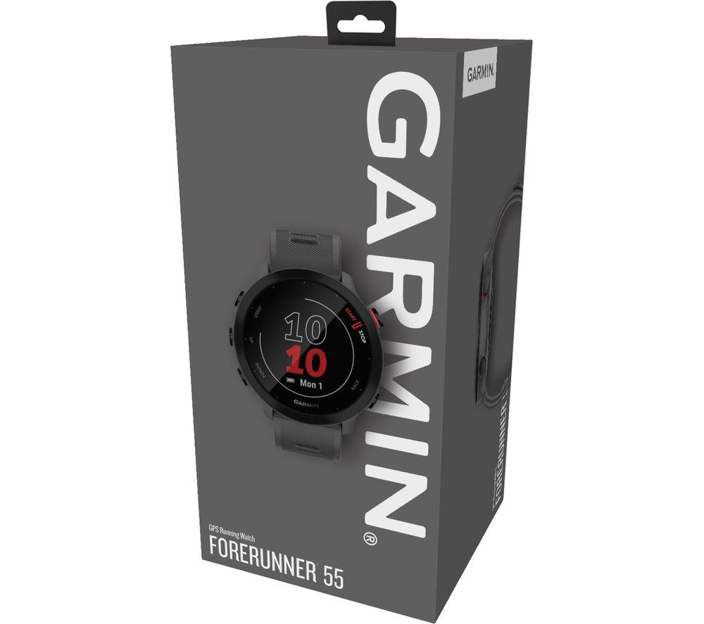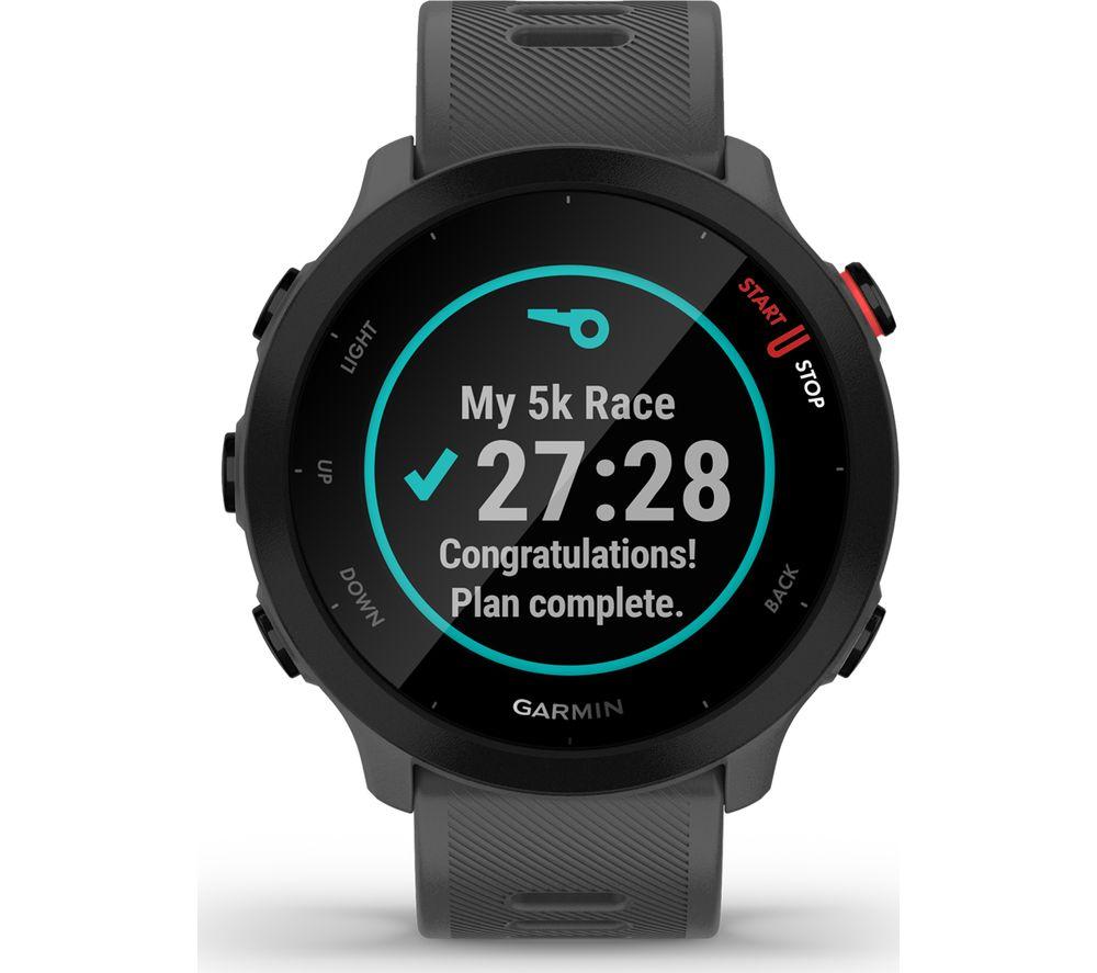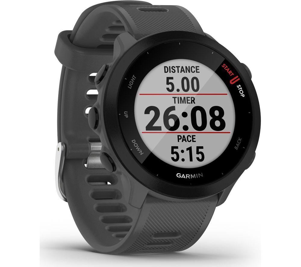 A running coach on your wrist Whether you're training for a 5K or a half marathon, the Garmin Forerunner 55 Running Watch is here to help you reach your goals. View your distance, time, and pace as you run to stay on track. With just five buttons, it's easy to use with no fiddly controls. Mark a lap or skip a song on your workout playlist with a quick press of a button. Is the race fast approaching? Download the Garmin Coach app to receive a personalised training plan that syncs straight to your watch. It adapts to your progress, so if you're exceeding expectations your coach will always keep up to push you further. Health tracking & activity profiles Stay informed about your wellbeing by tracking your heart rate, steps, calories and sleep. When worn 24/7, the collected data estimates your energy reserves, so you can find the most effective time for your workout. And it comes with pre-installed sports apps, including swimming, running, cycling and more - there's something for everyone. Read your texts without your phone Keep your phone somewhere safe when you're out on your morning jog - simply pair the Garmin Forerunner 55 to your smartphone get notified of any incoming calls and texts or to skip tracks on your playlist. For peace of mind, you can choose to share your location with family and friends. Or it can automatically detect incidents and send an alert to your chosen contacts. The display is easy to read too, even in direct sunlight.