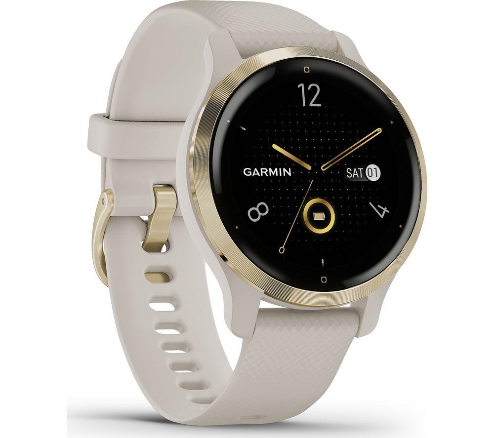 Not just a pretty face The Garmin Venu 2S is a blend of functionality and stylish design on in a small package right on your wrist. It tracks your health and workout sessions to help you better understand your body. And when it's time for a new look, you can switch up the strap or download new faces from the Garmin Connect IQ store. Smart notifications let you know what's going down in the group chat without being glued to your phone. See your texts and instant messages on the bright, AMOLED touchscreen. With up to 10 days of battery life you can don't have to worry about charging it every night. Work out with Garmin The Venu 2S comes with 25 built-in sports apps for both indoors and out. It can keep track of your vitals during your walks, runs, yoga, cycling, Pilates, hiking, indoor climbing and many more. You can even create your own workouts with Garmin Connect. For peace of mind when you're going on a run somewhere new, incident detection will let your location to your emergency contacts if there's an accident. Everyday health tracking Keep track of your daily step count, the floors you've climbed, and calories burned throughout the day. Body Battery finds the best times for activity and rest by measuring your heart rate, blood oxygen, menstrual cycle, hydration, respiration, sleep and more. Keep the music playing Stay motivated as you stretch. Connect your Bluetooth headphones to stream music straight from Spotify, Amazon Music or Deezer. There's also storage for up to 650 songs. That's one long workout playlist. Pay with your watch Instead of rummaging around in your bag looking for your wallet, use Garmin Pay next time you're grabbing your morning coffee. Simply swipe your Garmin Venu 2S against the reader, just like using contactless on your phone.