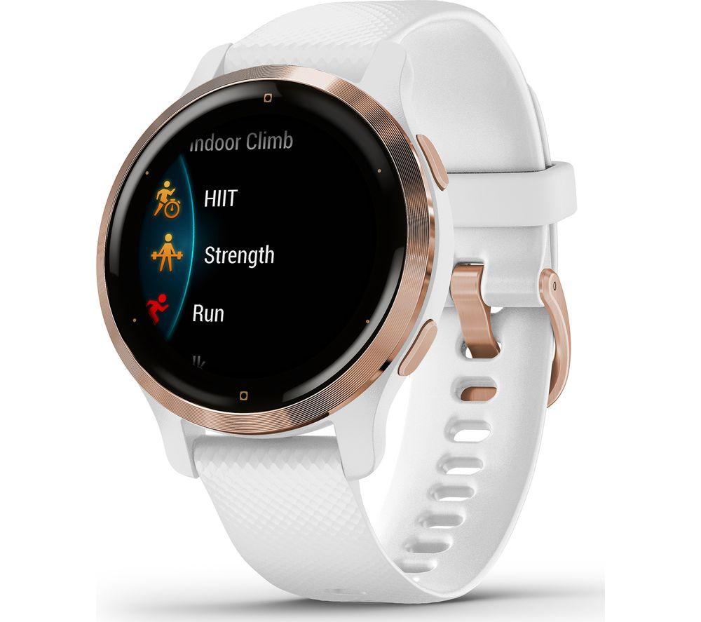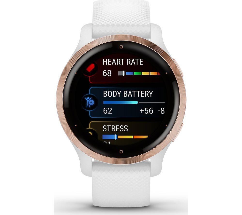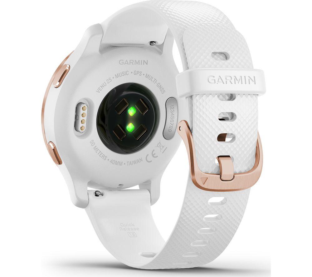 Not just a pretty face The Garmin Venu 2S is a blend of functionality and stylish design on in a small package right on your wrist. It tracks your health and workout sessions to help you better understand your body. And when it's time for a new look, you can switch up the strap or download new faces from the Garmin Connect IQ store. Smart notifications let you know what's going down in the group chat without being glued to your phone. See your texts and instant messages on the bright, AMOLED touchscreen. With up to 10 days of battery life you can don't have to worry about charging it every night. Work out with Garmin The Venu 2S comes with 25 built-in sports apps for both indoors and out. It can keep track of your vitals during your walks, runs, yoga, cycling, Pilates, hiking, indoor climbing and many more. You can even create your own workouts with Garmin Connect. For peace of mind when you're going on a run somewhere new, incident detection will let your location to your emergency contacts if there's an accident. Everyday health tracking Keep track of your daily step count, the floors you've climbed, and calories burned throughout the day. Body Battery finds the best times for activity and rest by measuring your heart rate, blood oxygen, menstrual cycle, hydration, respiration, sleep and more. Keep the music playing Stay motivated as you stretch. Connect your Bluetooth headphones to stream music straight from Spotify, Amazon Music or Deezer. There's also storage for up to 650 songs. That's one long workout playlist. Pay with your watch Instead of rummaging around in your bag looking for your wallet, use Garmin Pay next time you're grabbing your morning coffee. Simply swipe your Garmin Venu 2S against the reader, just like using contactless on your phone.