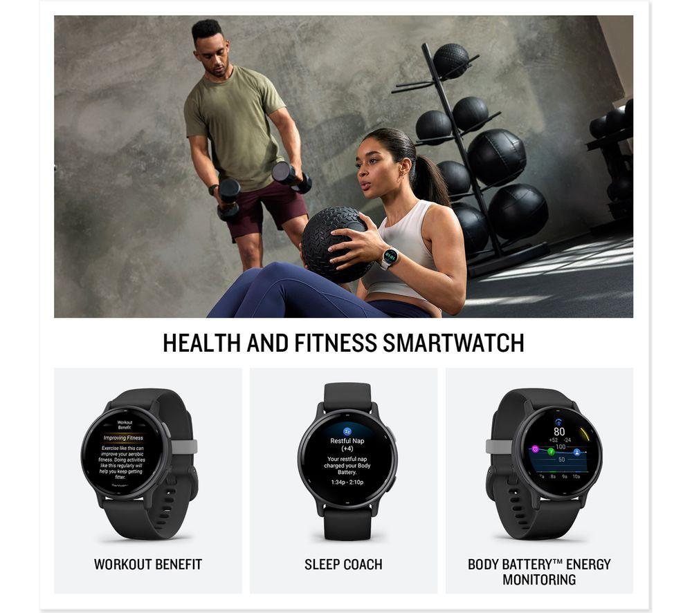 Keeping active is important but so is getting your rest. This Garmin vívoactive 5's Body Battery energy monitoring gives you personalised insights into your sleep, naps, stress levels and workouts. It helps you better understand when you need to take it easy or when you're primed and ready to go again. The Sleep Coach creates your very own sleep score with handy tips on how to get a better night's kip. And with the Morning Report, you'll be ready to hit your fitness goals as soon as you wake up. It sends loads of useful information like your sleep patterns and daily workout routines right to your wrist, so you won't have to reach for your phone.Good to know- Hit your stride with offline playlists - you can save tracks from Spotify, Deezer or Amazon and leave the phone at home- You get up to 11 days of battery life in smartwatch mode, and up to 21 hours in GPS mode- Wheelchair mode tracks pushes instead of steps and has preloaded workouts for strength, cardio and more- Keep a close eye on your ticker with the gen 4 heart rate sensor- When it all gets too much, give your mind a break with guided meditation practices- Pair it with your smartphone and get phone call, text and email notifications on your watch- Prepare for a 5K, 10K and half-marathon with the Garmin Coach, or create your own custom workouts in the Garmin Connect app- It's so much more than just a pretty face - see all your vital stats clearly on the 1.2” OLED screen____________________________________________________Please note: Offline music storage requires a premium subscription to Spotify, Amazon Music or Deezer.