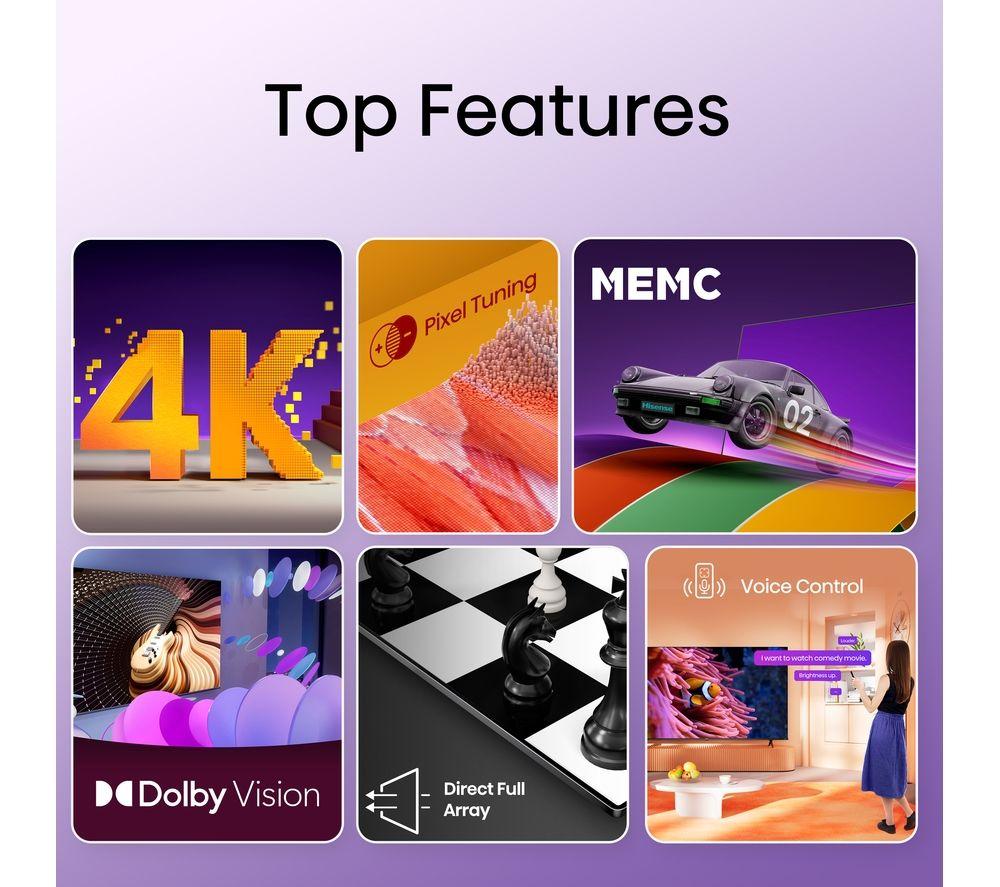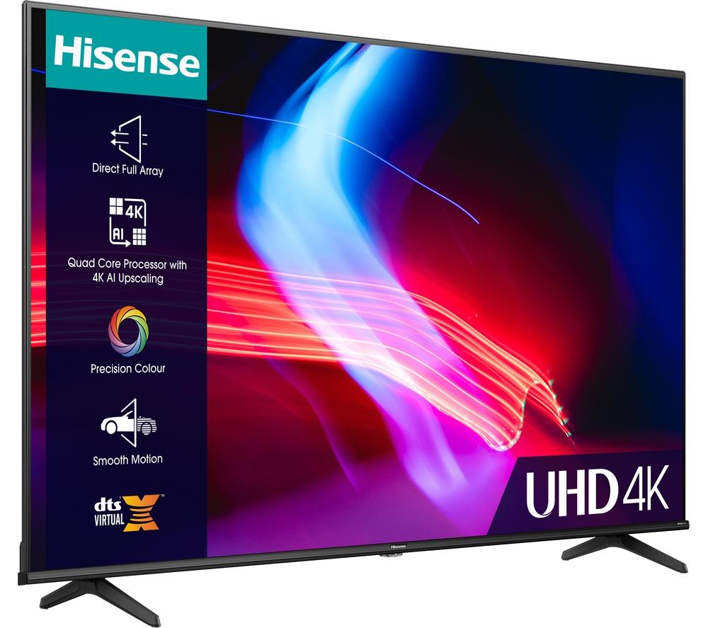 Your vintage movie marathon just got way more epic with this Hisense A6KT TV. It's UHD AI Upscaler enhances older content into near 4K resolution, so you'll see more detail in those old classics. With Dolby Vision HDR, you get the cinema experience in your front room. Blacks are darker, whites are brighter, and every scene looks true-to life - you may even forget you're looking at a screen. And with Colour Precision, colours are bold and vivid with a wider range of hues. So whatever you're watching, you can be sure it looks its best. Now, where's the popcorn?Good to know- With AI Sports Mode, even fast moving objects stay sharp and in focus - perfect for cup final day- DTS Virtual X separates dialogue from the background making it easier to hear, so you won't miss any crucial plot lines- Enjoy smooth gameplay and low latency with Game Mode Plus and gain the competitive edge on the battlefield- The TUV-certified Eye Care Mode looks after your eyes by reducing the amount of harmful blue light- Easily find all your favourite content and apps on the VIDAA Smart TV platform________________________________Please note: Some apps & services (including tuner) are only available in the UK. Apps & services may be removed or no longer supported by third party content providers at any time. Some apps & services may not be available at launch and may require a firmware update before becoming available. Some services require an account and/or subscription fee.