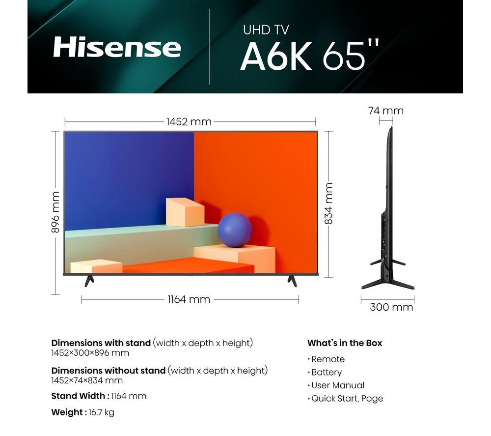 • Box contents :- Hisense 65A6KTUK 65' Smart 4K Ultra HD HDR LED TV- Stand- Remote control- Batteries- User manual- Power cable- Adapter