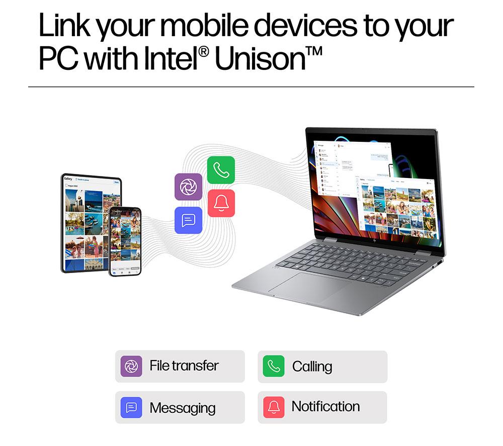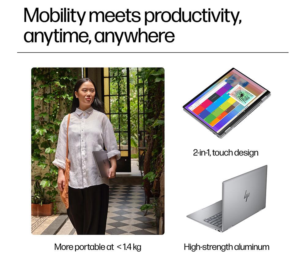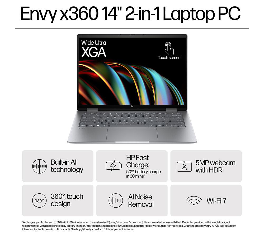There's no need to choose between a laptop and tablet anymore. With its 360-degree hinge, the HP ENVY x360 offers the best of both worlds. Powered by the Intel® Core Ultra 5 processor, it's super-fast and accelerated by AI to be even smarter. Perfect for speeding though work or school assignments. And when you're done, there's a Full HD+ touchscreen. You can swipe through Netflix until you find the perfect show. It's got beautiful colours and high brightness, so you're in for a treat. Good to know - Look your best on work calls - the 5 MP webcam features AI Noise Reduction so you'll be seen clearly by your colleagues - Windows Hello facial recognition is faster and safer than typing in a password - Load up websites and videos in no time thanks to Intel® WiFi 6E - 16 GB of DDR RAM lets you run multiple apps at the same time, including loads of browser tabs - The 512 GB SSD lets you store everything you need and loads up files in an instant ___________________________________________________________________________ Arc, Arria, Celeron, Cyclone, eASIC, Intel Ethernet, Intel,the Intel logo, Intel Agilex, Intel Atom, Intel Core, Intel Evo, Intel Inside, the Intel Inside logo, Intel Optane, Intel vPro, Iris, Killer, MAX, Movidius, Pentium, Intel Select Solutions, Intel Si Photonics, Stratix, the Stratix logo, Tofino, Ultrabook, Xeon are trademarks of Intel Corporation or its subsidiaries.