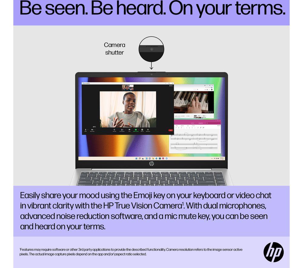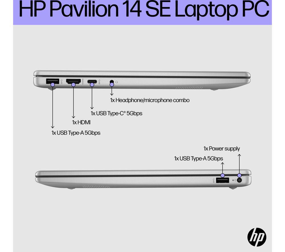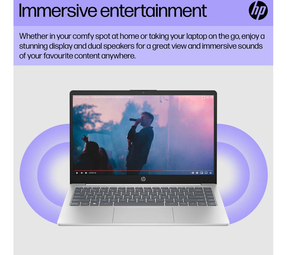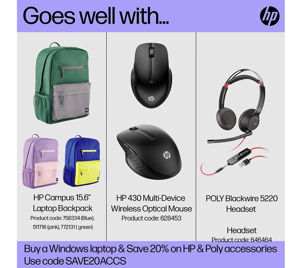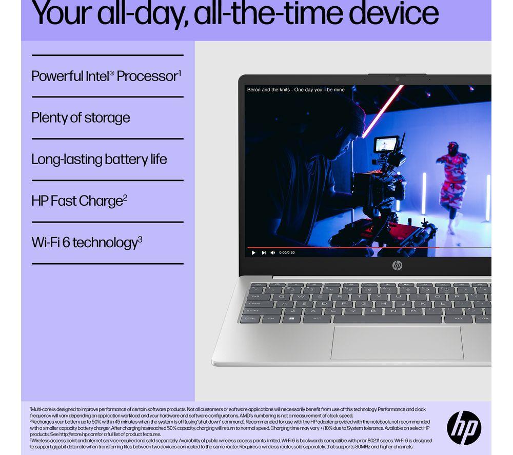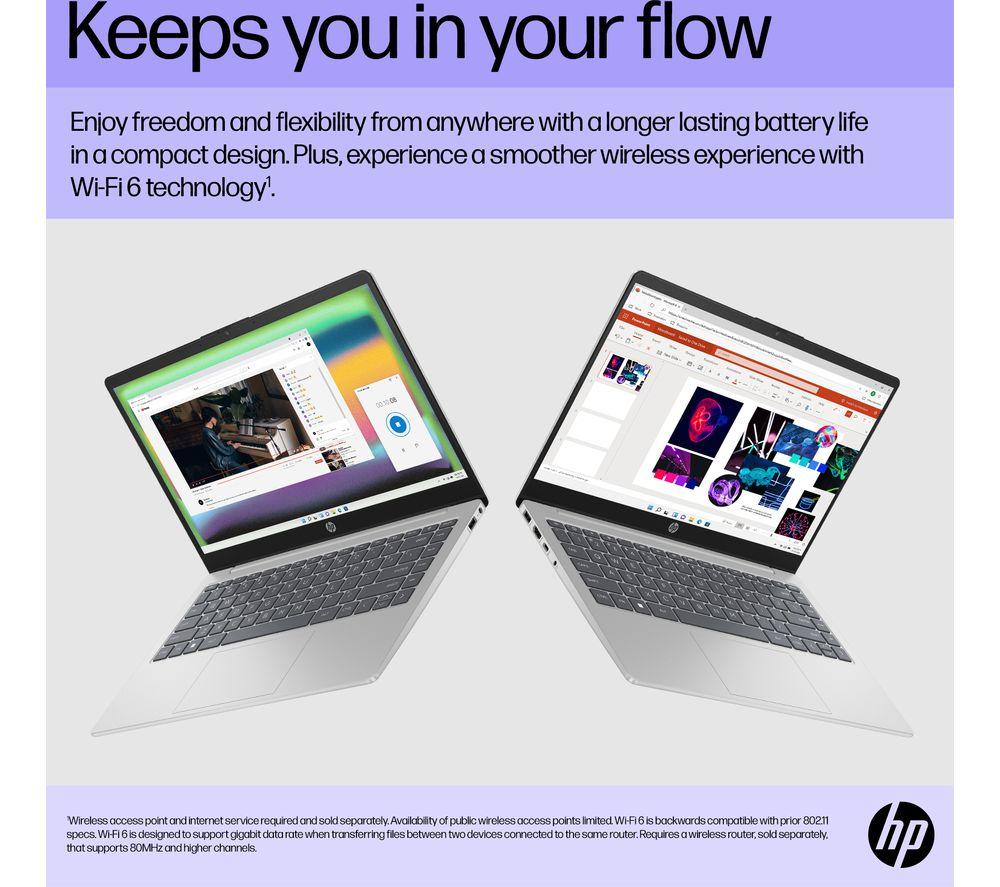 Work and play on the go with this HP. It's slim and lightweight - just 1.4 kg - so it'll pop into your bag without weighing you down. The Intel® Core i3 processor has enough power to keep things running smoothly. And the battery can last over 8 hours, which makes it great for working in cafes or libraries. When you do finally run out charge, HP fast charging gets it back to 50% in only 45 minutes. Just long enough for a well-deserved break!Good to know- 8 GB of RAM lets you run multiple apps at the same time and loads of browser tabs- Its Full HD screen and dual front-facing speakers are great for kicking back with a movie- 256 GB of SSD storage will give you speedy access to all your essentials- The Full HD webcam is perfect for work or family calls- Load up websites and videos in no time thanks to WiFi 6- You're all sorted for ports, with USB A, C, and HDMI all on board- Set up your home office anywhere – the anti-glare display can handle a bit of sunlight_______________________________________________________________Intel, the Intel logo, Celeron, Intel Atom, Intel Core, Intel. Experience What's Inside, Intel Inside, the Intel Inside logo, Intel Unite, Iris, Pentium, Thunderbolt, the Thunderbolt logo, and Ultrabook are trademarks of Intel Corporation in the U.S. and/or other countries.