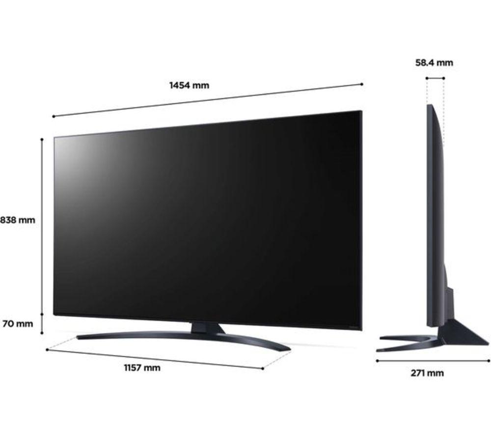 • Dimensions :- TV with stand: 908 x 1454 x 340 mm (H x W x D)- TV: 838 x 1454 x 58.4 mm (H x W x D)- Boxed: 970 x 1600 x 228 mm (H x W x D)