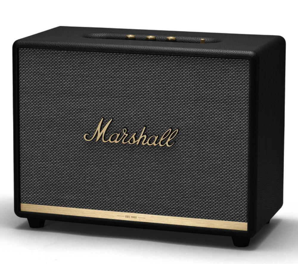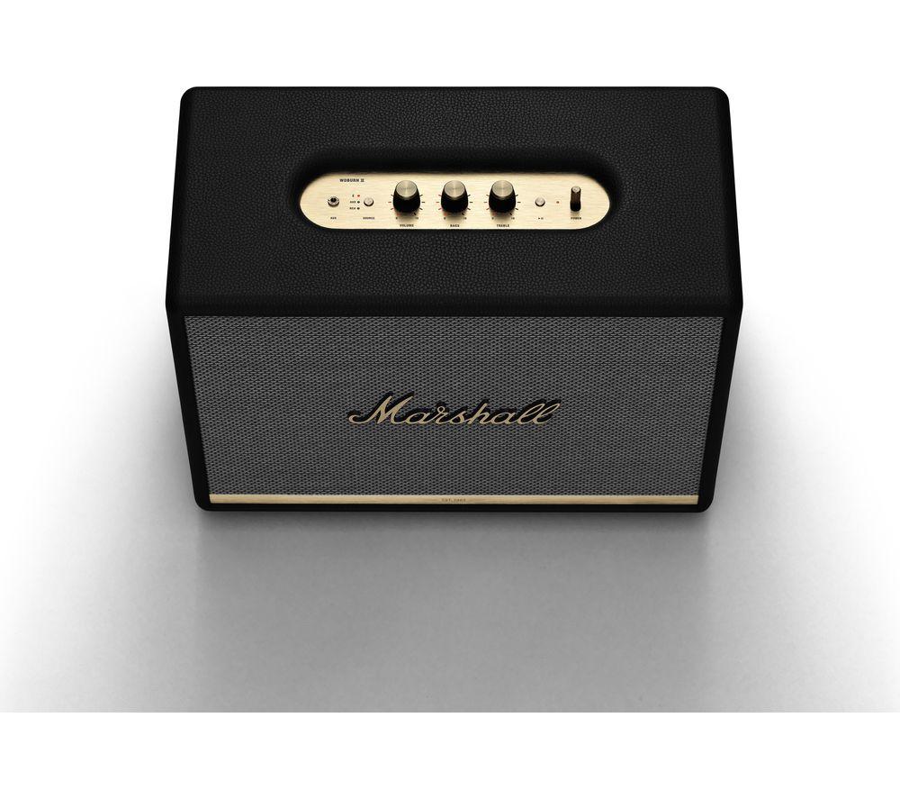 Iconic Marshall designGet stuck into rock anthems on a speaker that pays tribute to the amplifier your favourite guitarists use. The Marshall Woburn II Bluetooth Speaker borrows from the classic Marshall amplifier design, combining its timeless look with new technology.The analogue rotary controls are designed just like amplifier controls, adding an authentic feel and precise control over your tunes. So, whatever music you love, it'll sound just as good as it looks.Bluetooth 5.0Unlike your guitar, you won't need to trail a giant cable across the room to hear that catchy riff. The Marshall Woburn II Bluetooth Speaker features Bluetooth 5.0 technology, letting you connect your smartphone or tablet up to 10 metres away. It even has multi-host functionality, which is perfect when sharing DJ duties at parties, or if you have two devices with different music libraries.And with the Marshall Bluetooth app, you'll unlock your Marshall Woburn II's full potential. Connect with another Marshall speaker to pack twice the punch, and tweak the EQ to modify the sound signature exactly as you like.Powerful speaker configurationNo matter whether you prefer your music with crisp high hats or thunderous bass lines, the Marshall Woburn II Bluetooth Speaker delivers every frequency with clarity. Comprised of two tweeters and dual woofers, each powered by its own amplifier, the speaker pairs loudness with crisp, clear sounds. That means you'll be able to crank it up to eleven without distortion ruining the mix.