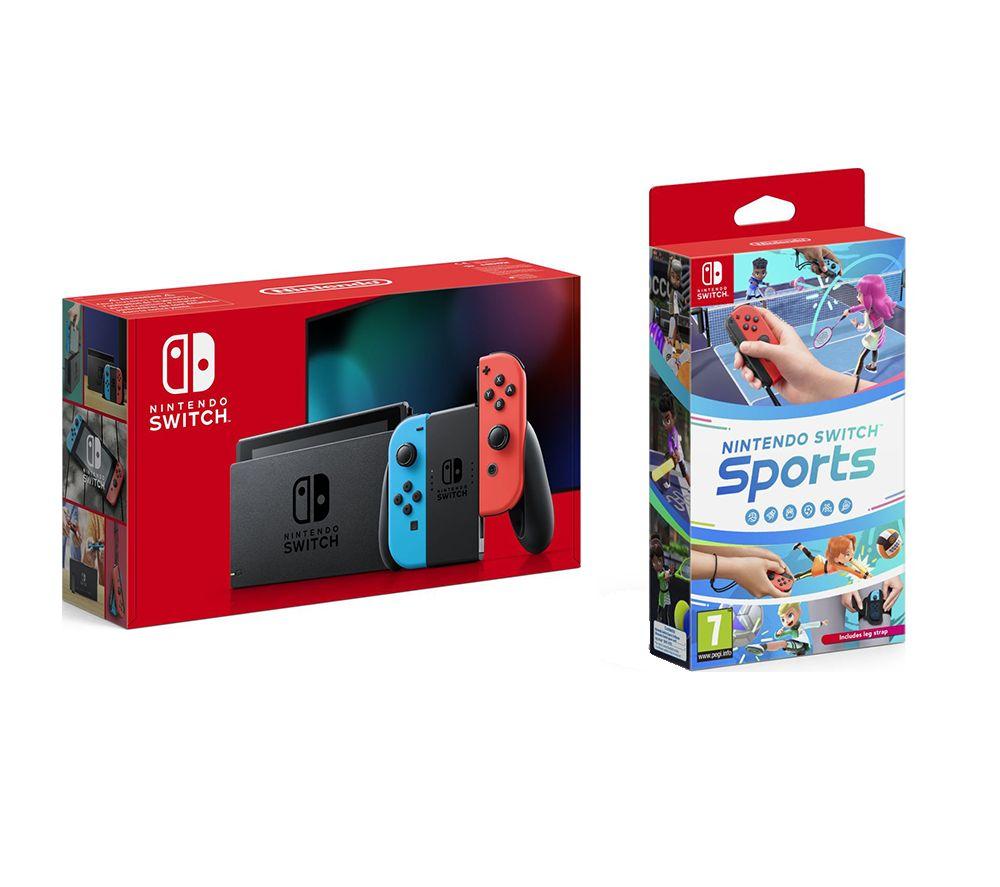 Get a new console and your first game with the Nintendo Switch & Sports Bundle._____________________________________________________________Nintendo Switch - Neon Red & BlueThis new version of the Nintendo Switch has all the same great features of the original Switch, just with a much longer battery life. Depending on your game, you'll get from 4.5 up to 9 hours of battery. Now when you're stuck on long journeys, you'll have even more gaming time.The Nintendo Switch is designed to go wherever you do. With the ability to transform between a home console and a portable system, the Switch lets you play your favourite games for longer. Connect the HDMI cable to your TV to enjoy a traditional console gaming experience, or prop up the stand attached to the back of the device to play games on its built-in screen. When the time comes to leave the house, you can carry on gaming by attaching the twin Joy-Con controllers to the console and using the 6.2\