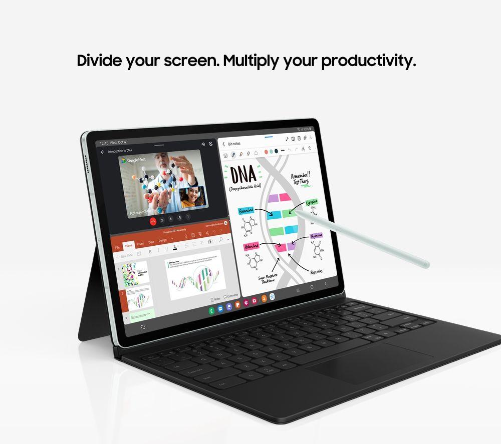 The Galaxy Tab S9 FE's got a screen to behold. The 2K display has a 90 Hz refresh rate, so the image isn't just super-sharp, but nice and smooth, too. So whether you're reading, binging or gaming, you'll have a great time. Or whip out the mighty S Pen and turn the Galaxy Tab into a notepad, sketchbook or a canvas. It's up to you and your creativity. The Exynos 1380 processor's got plenty of power, so it won't be holding you back. Good to know - From video calls to Insta-worthy selfies – the 8 MP rear camera and a 12 MP selfie camera will always make you look sharp - It's IP68 water-resistant, so getting caught in a rain shower doesn't have to bother you - AKG tuned dual speakers pump out full and punchy sound to match the screens visuals - You'll have plenty of space for your files and photos with 256 GB of storage  - Super Fast Charging means you can quickly top-up the battery level between uses (45W Super Fast charger sold separately) - It supports WiFi 6 connection for super-fast and rock-steady internet - A fingerprint scanner keeps the tablet secure and for your eyes only