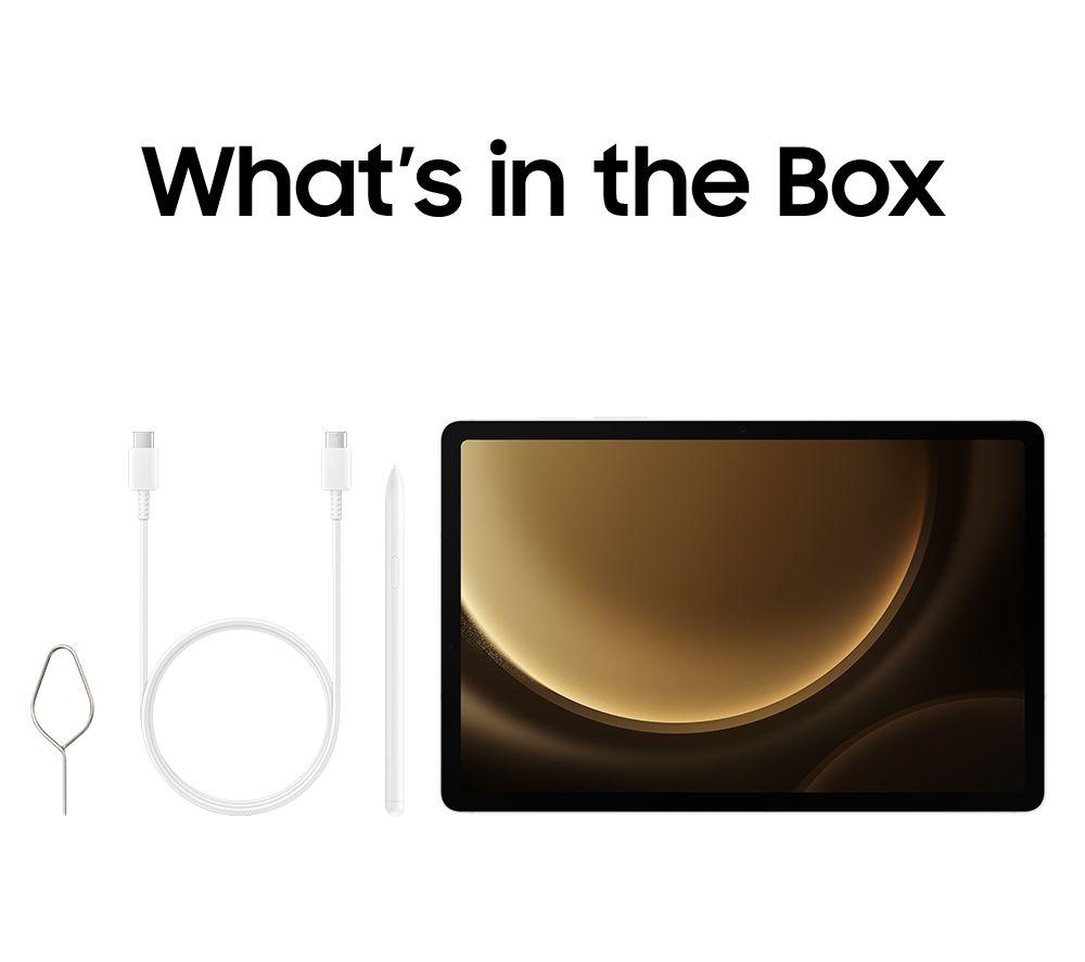 • Box contents :- Samsung Galaxy Tab S9 FE 10.9' Tablet (SM-X510NZSEEUB)- S Pen- USB Type-C cable- Ejector pin- Quick start guide