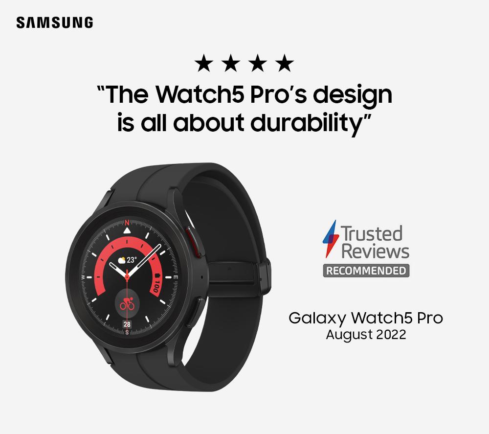 Get off the beaten track – this Samsung Galaxy Watch5 Pro can be your guide as well as your performance coach. The active GPS can provide turn-by-turn navigation on pre-plotted routes, while Track Back is perfect for guiding you back home. With sophisticated fall detection, it can send alerts to emergency contacts if you take a tumble. There are loads of ways to track your health - monitor heart rate and blood pressure, or track sleep and get tips. The titanium frame and tough bezel means that it looks great and is tough enough to last.Good to know- Leave your phone at home thanks to 4G connectivity for calls and updates on the move- Pay for your coffee with your watch – Samsung Pay uses NFC so you can make contactless payments- It's water resistant to 50 m, so don't let rain or splashes put you offPlease note:Fall detection can initiate Emergency call and message if you take a hard fall and don't seem to move. It cannot detect all falls. The more physically active you are, the more likely you are to trigger Fall Detection due to high impact activity that can appear to be a fall. Sending SOS calls and messages requires a network connection and smartphone pairing.