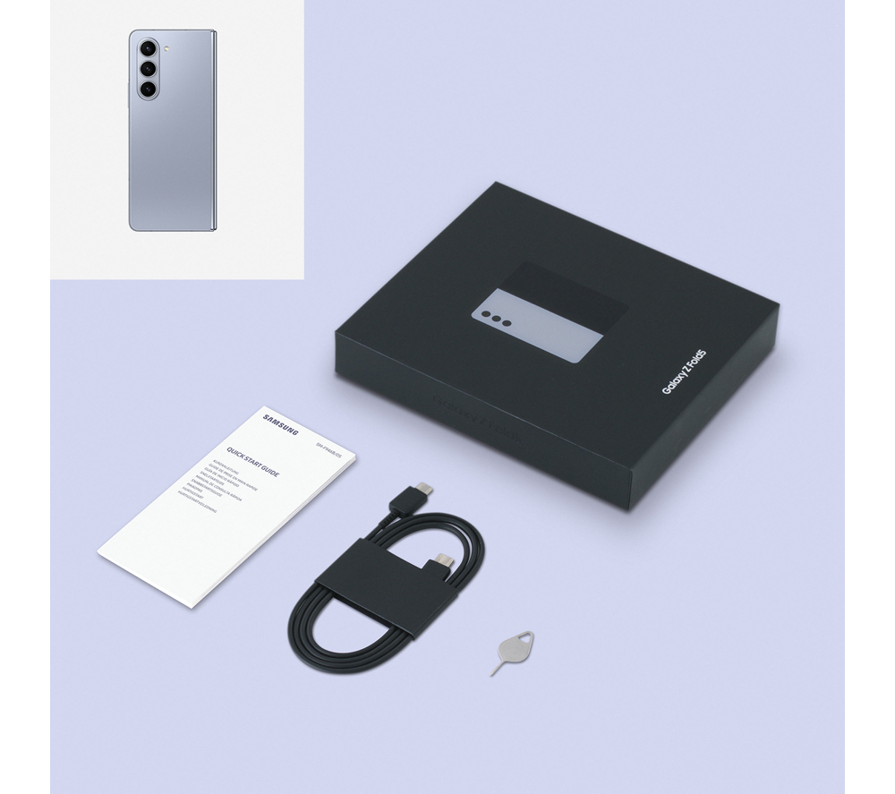• Box contents :- Samsung Galaxy Z Fold5- USB Type-C cable- Quick start guide- Warranty card- Tray pin