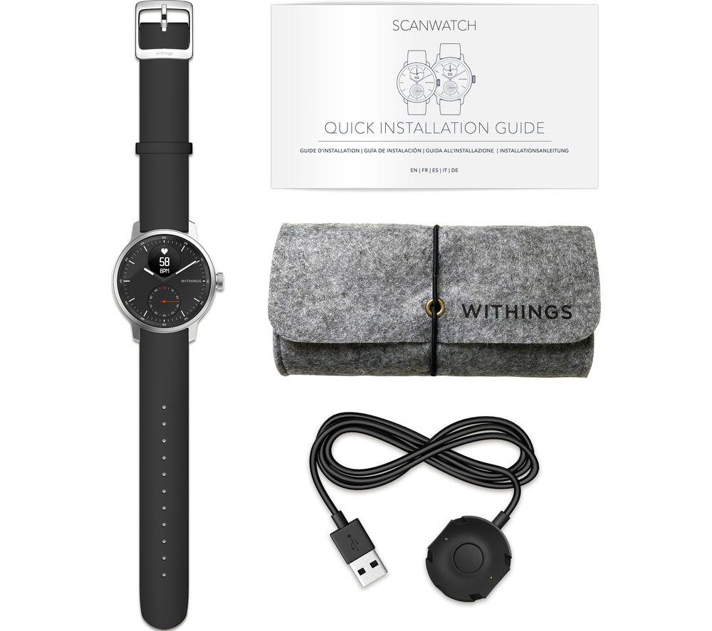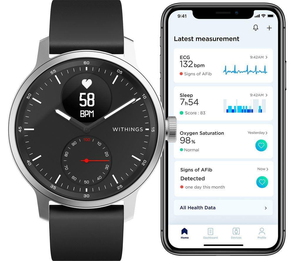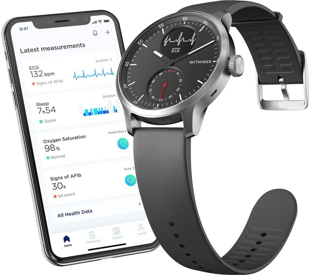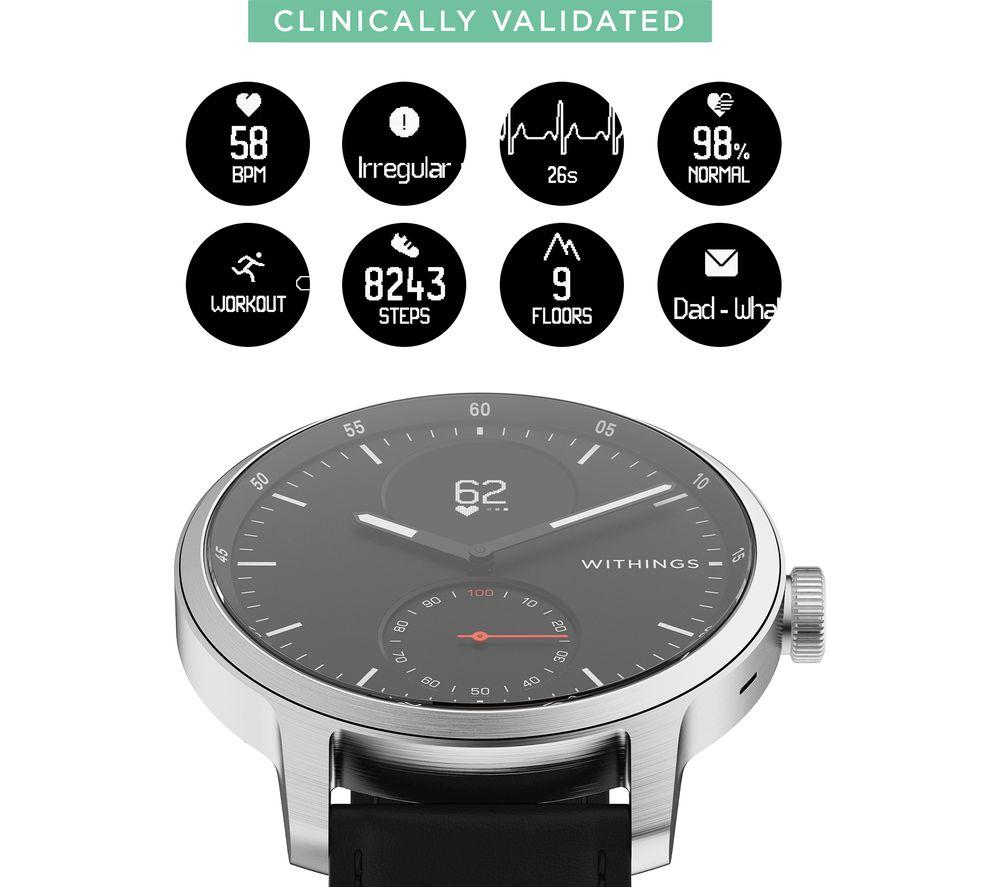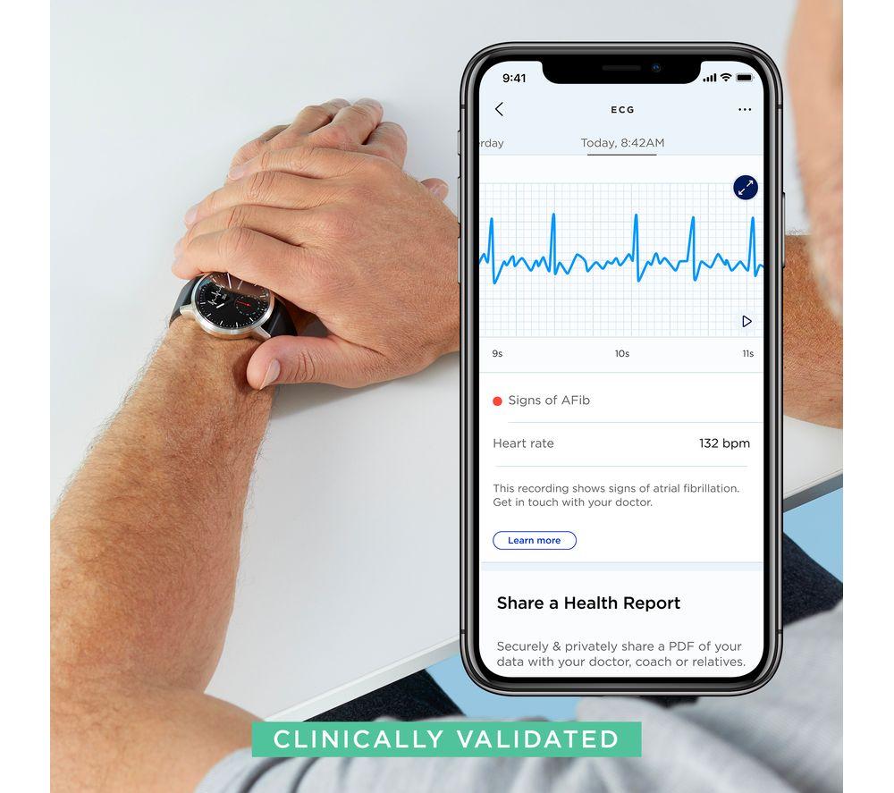 ScanWatch isn't just a snazzy smartwatch with health tracking – it's a medical-grade electrocardiogram. That means it can reliably detect potentially serious heart rate irregularities, including atrial fibrillation. And you can relax because you'll be notified in real-time, 24-7. You'll sleep soundly too, with clinically validated SPo2 keeping a watchful eye. Throughout the night, sensors monitor your breathing for disturbances that could be associated with apneic episodes. And while ScanWatch can't fix your snoring, your partner will appreciate the Smart Wake Up system. It picks the optimal moment in your sleep cycle to wake you up – silently. Good to know - PPG heart rate and activity tracking across 30 different activities, so you can watch your fitness progress - Like 21st century tech but classic design? The analogue clock with brass dial is paired with a steel rotary wheel that toggles through your health stats - The secondary PMOLED screen displays live health stats and works great in bright sunlight - Take it to the deep end of the pool - it's swimproof to 50 m and you get fancy stroke breakdowns - Simply pair ScanWatch to your phone and connected GPS lets you track distance, pace and elevation on runs - Just start running or swimming and the watch automatically detects your workout - No more excuses for missed calls when all your smartphone notifications go straight to the watch - Wear it as a traditional watch and the battery will last you up to 30 days ______________________________________ Please note: ScanWatch has received CE medical certification in Europe and FDA clearance in the United States. You should not use ScanWatch if you wear a pacemaker or other internal medical device.