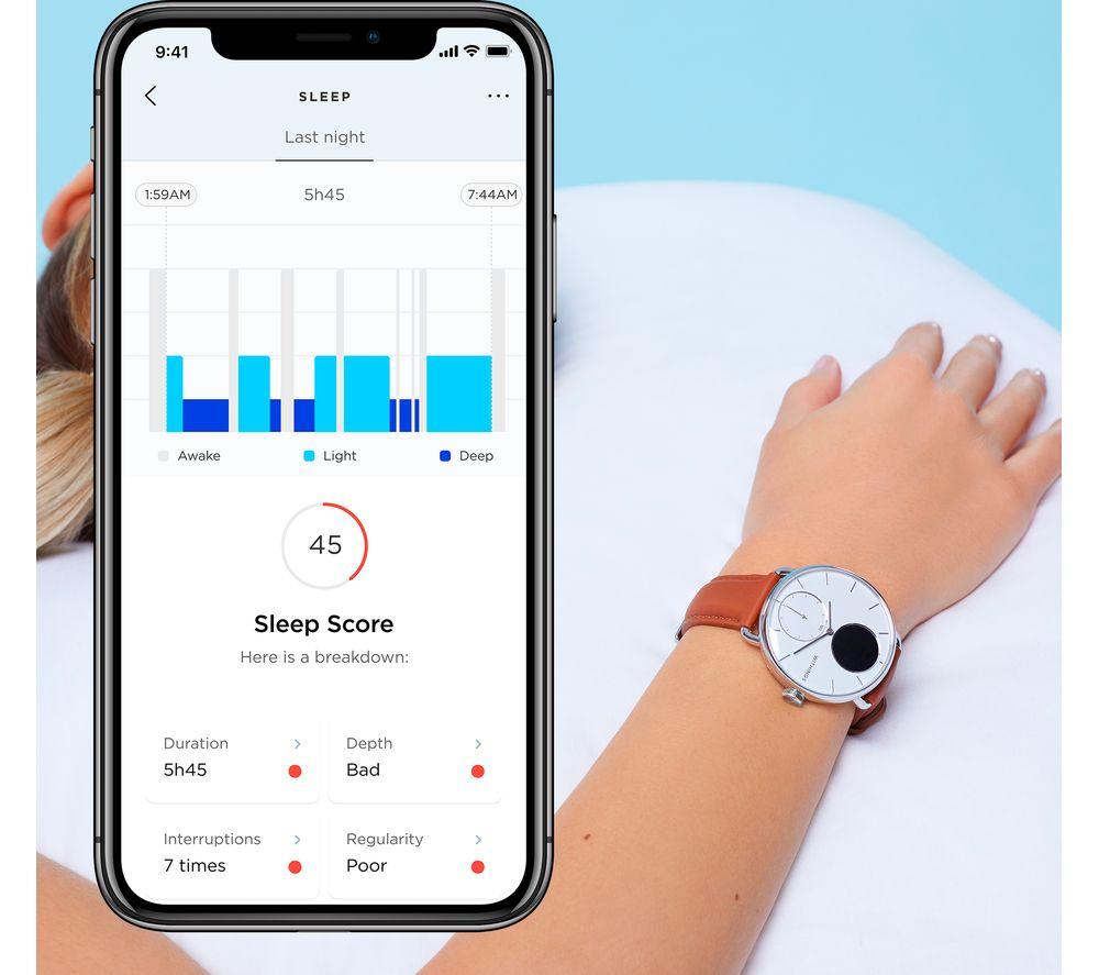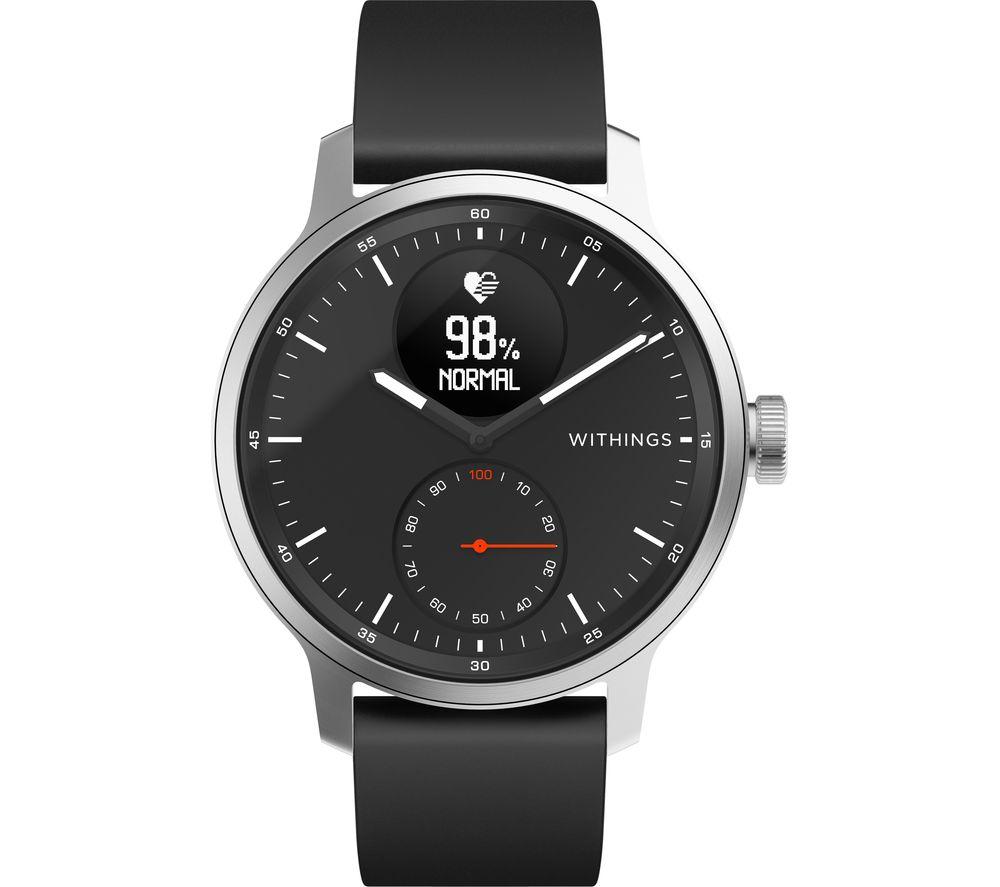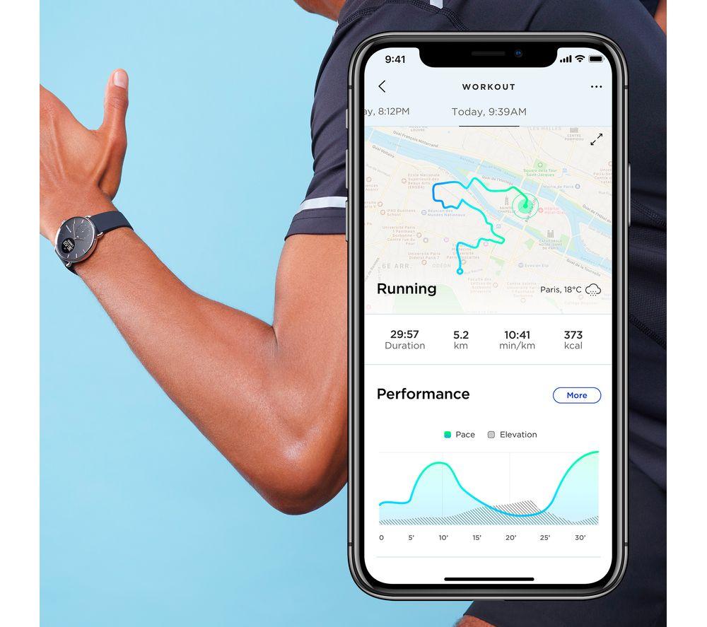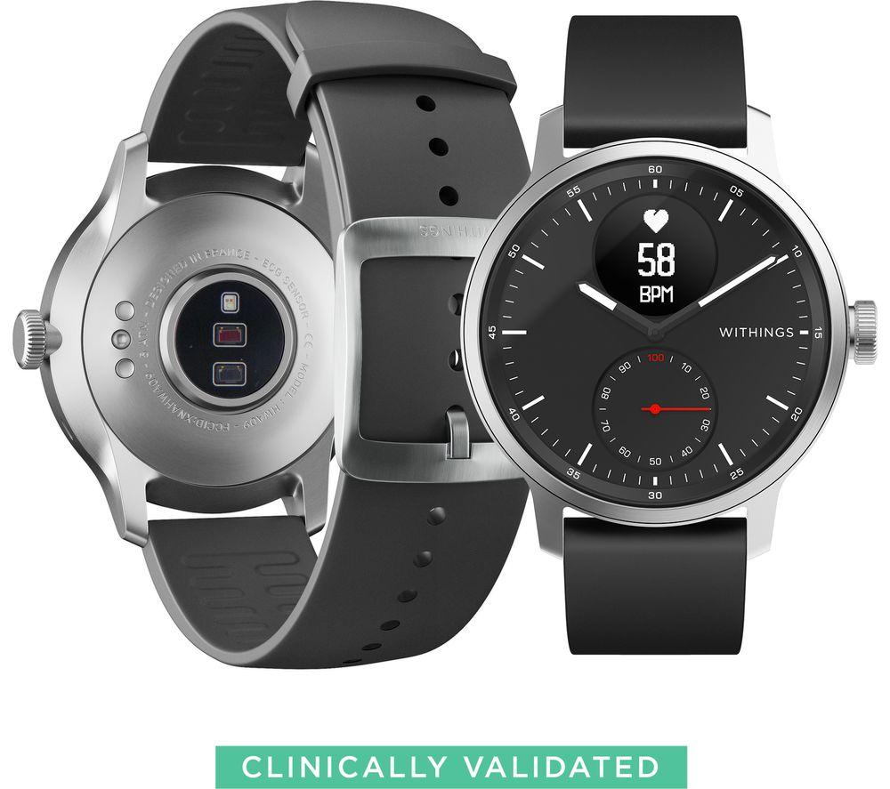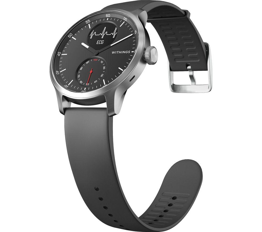 ScanWatch isn't just a snazzy smartwatch with health tracking – it's a medical-grade electrocardiogram. That means it can reliably detect potentially serious heart rate irregularities, including atrial fibrillation. And you can relax because you'll be notified in real-time, 24-7. You'll sleep soundly too, with clinically validated SPo2 keeping a watchful eye. Throughout the night, sensors monitor your breathing for disturbances that could be associated with apneic episodes. And while ScanWatch can't fix your snoring, your partner will appreciate the Smart Wake Up system. It picks the optimal moment in your sleep cycle to wake you up – silently. Good to know - PPG heart rate and activity tracking across 30 different activities, so you can watch your fitness progress - Like 21st century tech but classic design? The analogue clock with brass dial is paired with a steel rotary wheel that toggles through your health stats - The secondary PMOLED screen displays live health stats and works great in bright sunlight - Take it to the deep end of the pool - it's swimproof to 50 m and you get fancy stroke breakdowns - Simply pair ScanWatch to your phone and connected GPS lets you track distance, pace and elevation on runs - Just start running or swimming and the watch automatically detects your workout - No more excuses for missed calls when all your smartphone notifications go straight to the watch - Wear it as a traditional watch and the battery will last you up to 30 days ______________________________________ Please note: ScanWatch has received CE medical certification in Europe and FDA clearance in the United States. You should not use ScanWatch if you wear a pacemaker or other internal medical device.