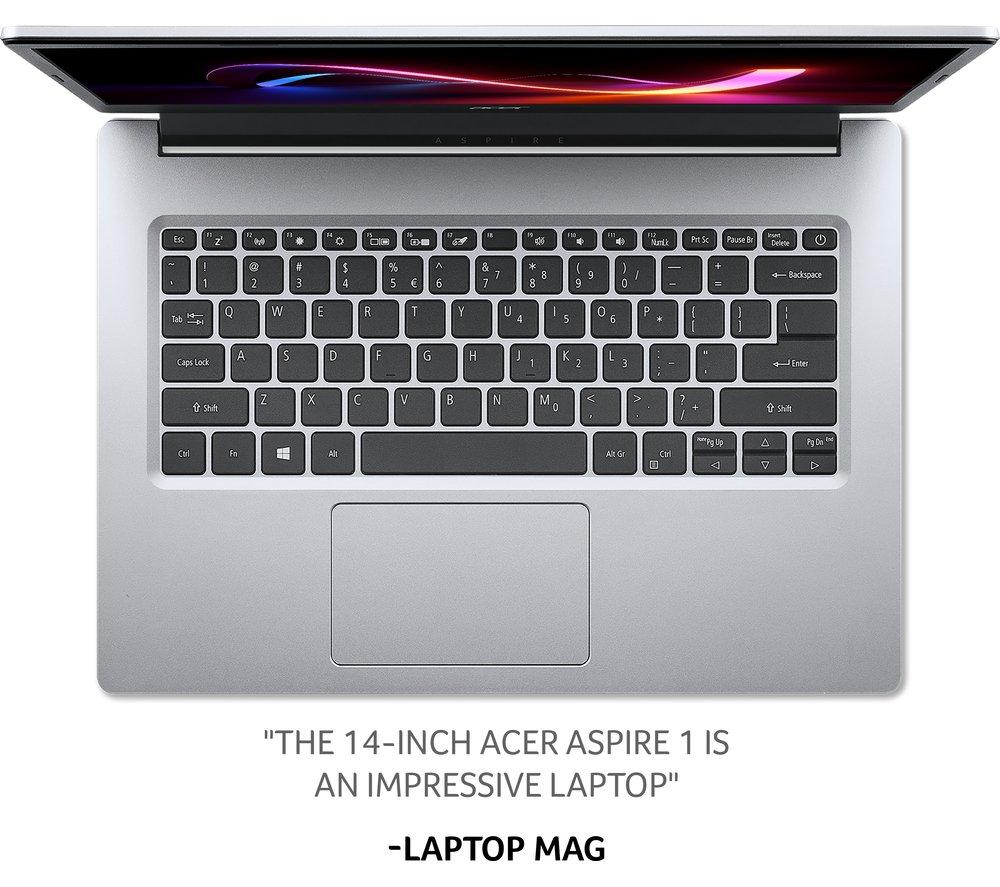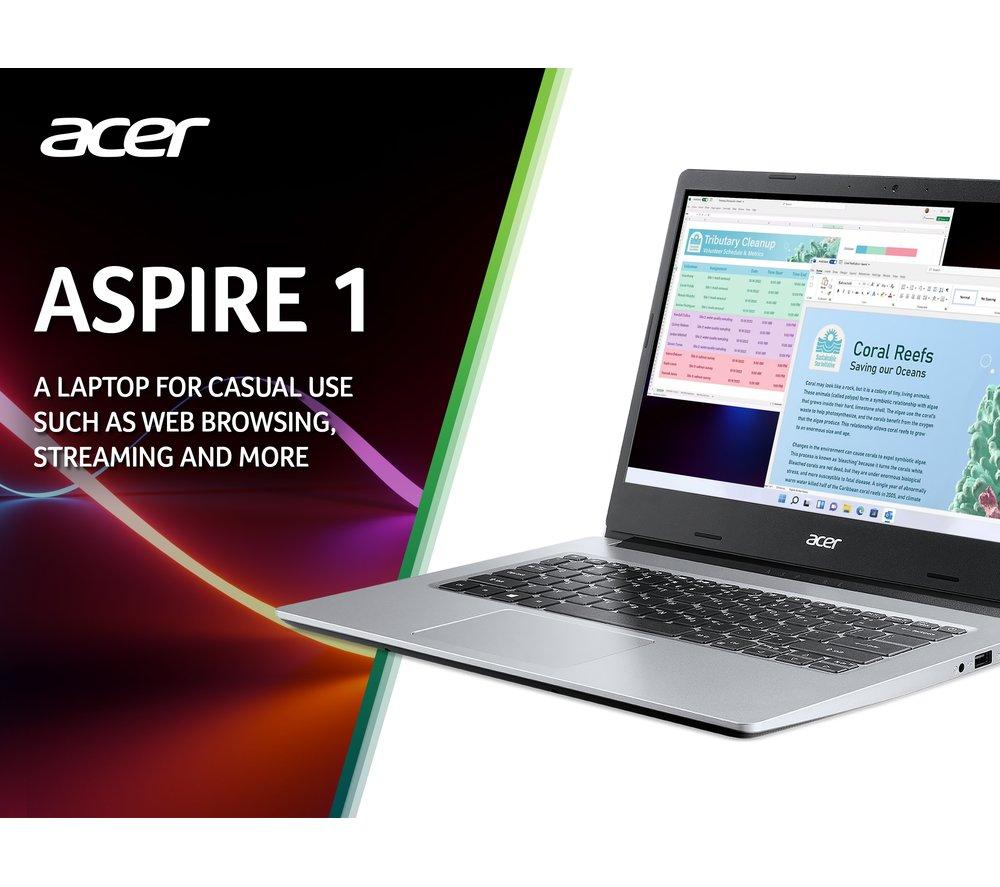 Sleek design, built for on-the-goIf you're looking for something you can take with you to lectures or on the train for commute entertainment, the Aspire 1 only weighs 1.45 kg, so you can carry it all day without ever noticing it. With up to 8 hours of battery life, you won't have to fight for a spot near a plug socket next time you're working in a cafe either.Featuring a quick and reliable Intel® Celeron® processor, The Aspire 1 enables you to get online, finish up an essay or project for work, and watch videos with ease.HD screen with BluelightShieldPhotos, videos and websites look clear and colourful on the high-definition LED screen. Work comfortably for longer periods with reduced eye strain using BluelightShield technology, which filters out blue light.Comfortable keyboard and precision touchpadThe Aspire 1 is designed for comfortable typing, with spaced out keys that are responsive yet quiet, so you can stay productive even when you need to be discreet.The precision touchpad makes navigating menus and apps simple and effortless. Using the intuitive gesture controls you can pinch to zoom, scroll like you do on your smartphone and interact with things in a natural, familiar way.\nGet a free upgrade to Windows 11Featuring an all new interface, improved Start menu and multi-tasking tools to enhance your productivity, Windows 11 is here. You'll get a free upgrade with this laptop.Please note: This PC includes Office 365 Personal for a year. All you have to do is activate it within six months of setting up your laptop. Easy.Specific timing for Windows 11 release will vary by device and certain features require specific hardware. Please see Microsoft website for details.\n___________________________________________________________Intel, the Intel logo, Celeron, Intel Atom, Intel Core, Intel. Experience What's Inside, Intel Inside, the Intel Inside logo, Intel Unite, Iris, Pentium, Thunderbolt, the Thunderbolt logo, and Ultrabook are trademarks of Intel Corporation in the U.S. and/or other countries.