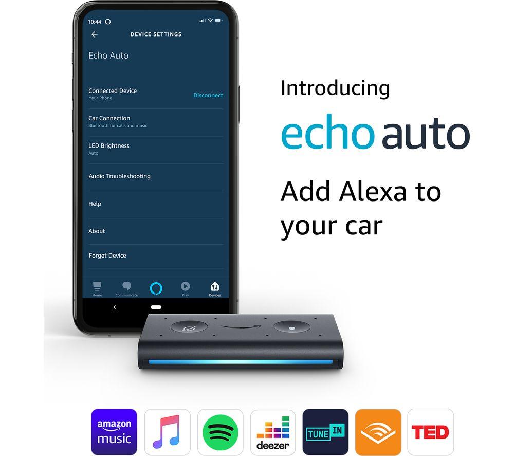 Add Alexa to your carBring Alexa with you on your car journeys with the Amazon Echo Auto. It connects through the Alexa app on your smartphone to play through your car's speaker via auxiliary jack or Bluetooth. You can listen to music, ask questions and make hands-free calls as you drive.Your voice in the driver's seatWhether you want to check your calendar, listen to Audible or update your to-do list, Alexa is here to help. Simply say, \