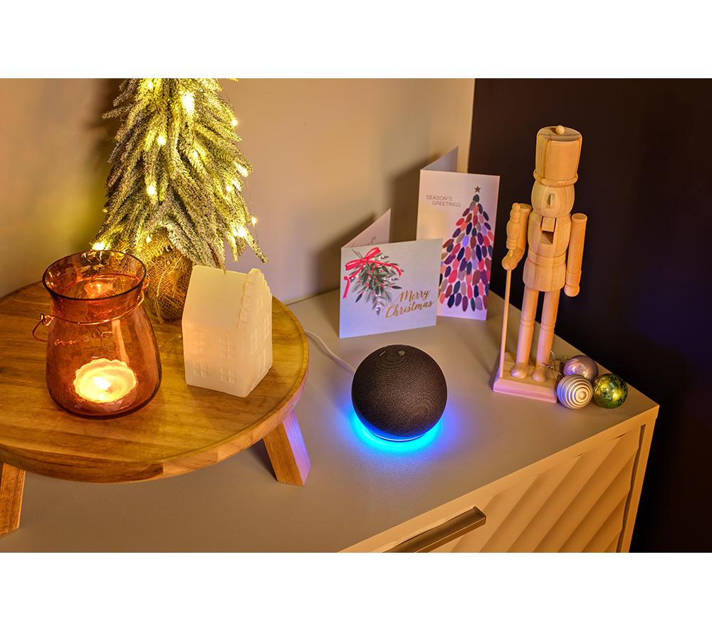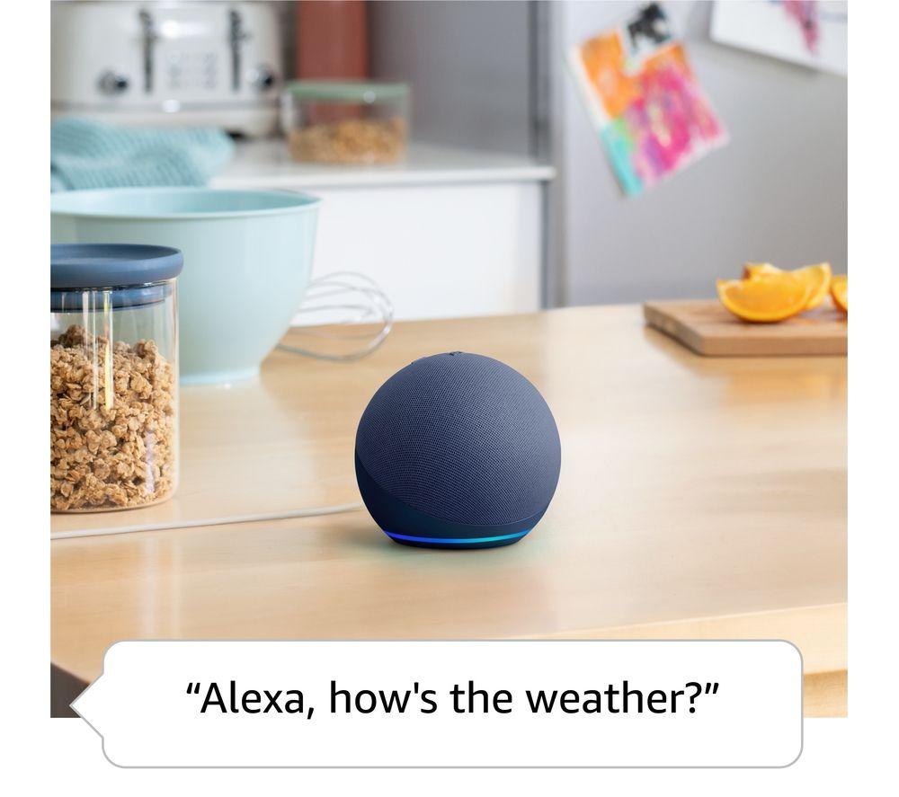 “Alexa, show me Amazon's best-sounding Echo Dot yet”. Meet the 5th generation of the Amazon Echo Dot. It's the same dinky size as the 4th gen, but Amazon have packed in a larger driver, so it sounds louder than ever. Playing music and podcasts from the likes of Amazon Music, Spotify, and BBC Sounds is just an ask away. Alexa, the built-in voice assistant, is always happy to help – no matter how trivial. Get weather updates before you head out the door, add something to your shopping list mid-way through cooking, or set a reminder to get the kids' PE kit together. Alexa can even tell you a joke (laughs not guaranteed). It can help with the smart stuff around your home too. The built-in temperature sensor will tell your smart thermostat when to tweak the heating, you can set routines to switch on things like smart lights, and of course you can ask Alexa.Good to know- Tap controls make it easy to pause music, end calls, or snooze alarms- Can be paired with other Echo devices or Fire TV for multi-room music or to boost your TV sound- Personalise your Alexa Privacy settings on the app or by asking Alexa – there's a mic-off button too- It's super simple to setup – just plug in and use the Alexa app to connect to WiFi and get started- As part of a drive to reduce waste, 55% of the plastic parts and 95% of the fabric used is from post-consumer recycled materials- WiFi need a boost? If you've got an eero router you can use your Echo speaker as a WiFi extender