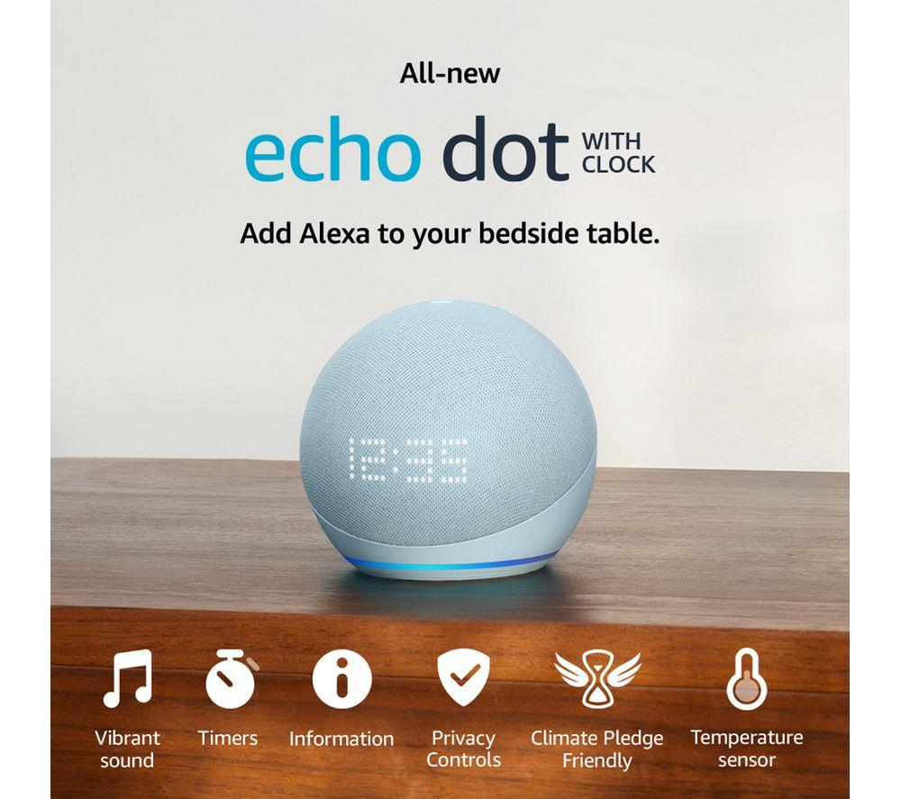 “Alexa, show me Amazon's best-sounding Echo Dot yet”. Meet the 5th generation of the Amazon Echo Dot with clock. It's the same dinky size as the 4th gen, but Amazon have packed in a larger driver, so it sounds louder than ever. Wake up to the radio or music and podcasts from the likes of Amazon Music, Spotify, and BBC Sounds. It's the perfect bedside table companion thanks to the LED display. It can show you the time, alarms, weather, song titles, and more. Alexa, the built-in voice assistant, is always happy to help – no matter how trivial. Get weather updates before you head out the door, add something to your shopping list mid-way through cooking, or set a reminder to get the kids' PE kit together. Alexa can even tell you a joke (laughs not guaranteed). It can help with the smart stuff around your home too. The built-in temperature sensor will tell your smart thermostat when to tweak the heating, you can set routines to switch on things like smart lights, and of course you can ask Alexa.Good to know- Tap controls make it easy to pause music, end calls, or snooze alarms- Can be paired with other Echo devices or Fire TV for multi-room music or to boost your TV sound- Personalise your Alexa Privacy settings on the app or by asking Alexa – there's a mic-off button too- It's super simple to setup – just plug in and use the Alexa app to connect to WiFi and get started- As part of a drive to reduce waste, 55% of the plastic parts and 95% of the fabric used is from post-consumer recycled materials- WiFi need a boost? If you've got an eero router you can use your Echo speaker as a WiFi extender