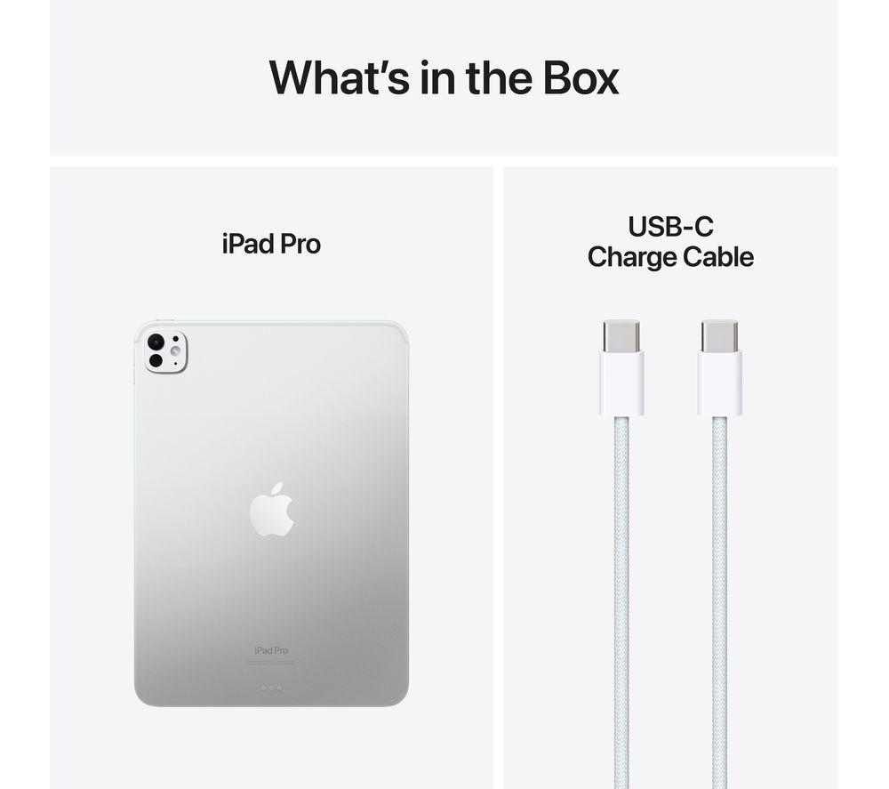 Apple iPad Pro is here to make your ideas a reality. It's built around the new, insanely powerful M4 chip. With an upgraded CPU, GPU and Neural Engine, this iPad Pro's up to 1.5x faster than the last one. Multitasking, video editing and gaming are all a piece of cake for this powerhouse. And it'll all look better than ever on the new Ultra Retina XDR display. It uses an innovative tandem OLED panel to bring images to life in incredible colour, contrast and brightness. All that power is packed into a body that's impossibly thin. It measures just 5.3 mm, so it'll disappear into your bag until it's time to get stuff done. Good to know - iPadOS 17 is full of powerful features and apps for productivity, entertainment and everything in-between - The 12 MP front-facing camera is now in a landscape orientation, which is perfect for FaceTime - You can shoot 4K ProRes video and amazing images on the 12 MP Wide camera on the back - The ProMotion display brings movement to life with a dynamic refresh rate between 10 and 120 Hz - There's a Four-speaker system that'll immerse you in your favourite movies and shows - With WiFi 6E you'll have fast and rock-solid internet connection - Face ID is a super-fast and secure way to unlock your iPad and keep your data private - A single charge gives you up to 10 hours of battery life – plenty of time for work and fun - Hook up a 6K external display and other accessories with Thunderbolt