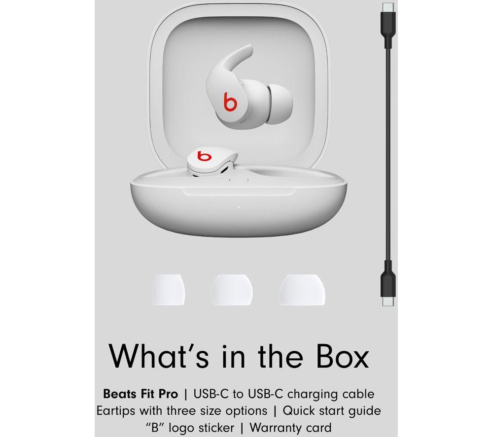 • Box contents :- Beats Fit Pro Wireless Bluetooth Noise-Cancelling Sports Earbuds- Silicone ear tips with three size options (S/M/L)- Charging case- USB Type-C to USB Type-C charging cable- Quick start guide- Warranty card
