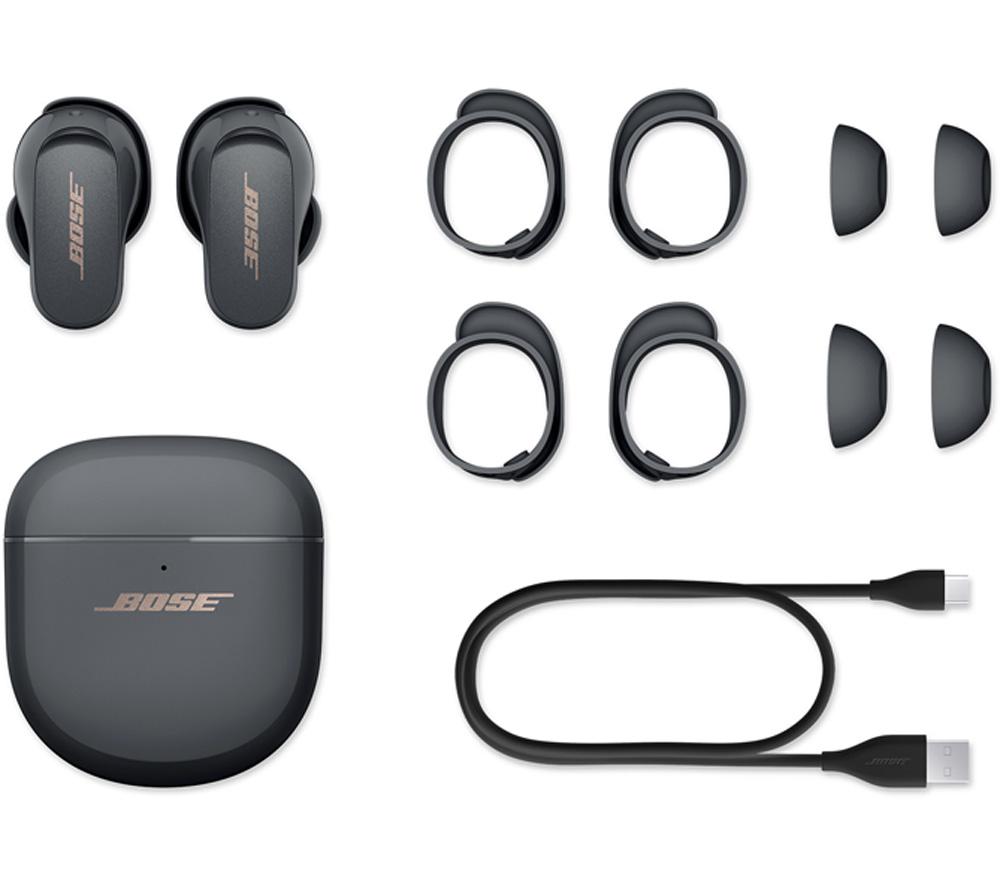 Like a sharp suit, everything is better when it's tailored to you. The Bose QuietComfort II Earbuds use CustomTune sound calibration that tweaks the sound and noise-cancelling to suit the way you listen. And these aren't just any old noise-cancelling earbuds. The QuietComfort II represent a revolutionary advance in noise-cancelling technology. It starts with the perfect fit for a tight seal – and the included Fit Kit makes sure you'll find it. Combined with mics which block out background chatter, you'll be able to appreciate songs in a whole new light – and catch every word of your audiobook. As you'd expect from Bose, there's no compromise when it comes to sound. Each wireless earbud is packed with custom-designed tech that delivers life-like and balanced sound with nuance, clarity, and depth. Good to know - You won't need to reach for your phone with simple touch controls for playback, calls, and noise-cancellation - Your music will automatically pause when you remove an earbud, so you can easily have a chat - Aware Mode lets you hear what's going on around you – and you can switch on ActiveSense to soften loud noises, like a passing bus- Noise-rejecting mics pick out your voice from your surroundings, so you'll be heard loud and clear on calls - The buds are water resistant, so you don't have to worry about getting caught in a downpour- You can take one of the earbuds out of your ear and the other one will keep playing – amazing for phone calls - Between listens, pop the earphones back in the case for up to 24 hours of listening time