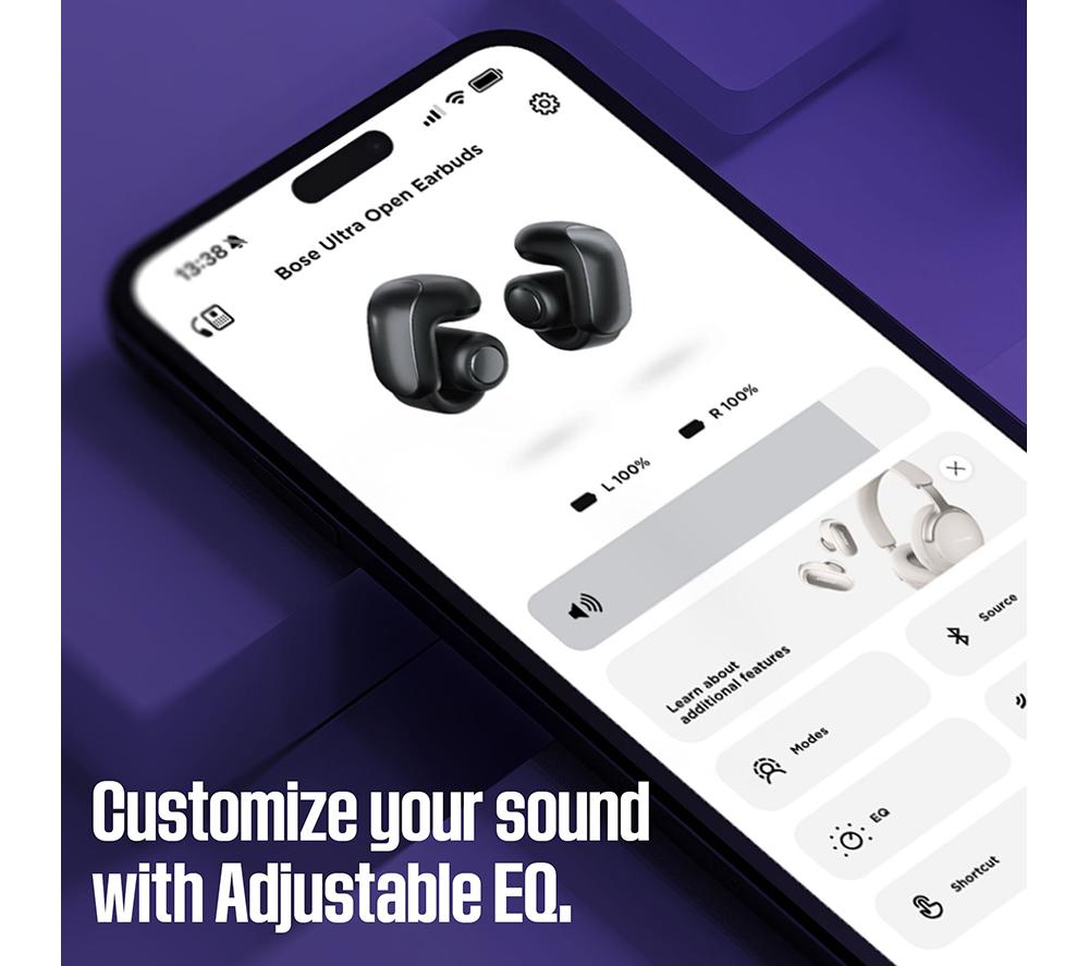 Get closer to your music with these Bose Ultra Open earbuds. Their OpenAudio technology lets you rock out to your tunes while staying savvy to the world around you. Hear every face-melting riff and delayed train announcement as clear as a bell. But why just listen to your music when you can feel it? Bose Immersive Audio adds a sense of space and dimension so you'll feel like you're right there in the studio with the band. And thanks to their flexible joint and lightweight grip, you can wear them all day in complete comfort. Just hook them behind your ears and get your groove on.Good to know- You get up to 7.5 hours of battery on a single charge with an extra 19.5 hours from the charging case- Skip songs, crank the volume and take calls with the easy-to-use button controls- Their IPX4 rating means they're not afraid of a little rain or sweat – perfect for those epic workouts- Pair them with your compatible Bose soundbar or speakers with Bose SimpleSync technology- Turn on Auto Volume via the Bose app and your music will adapt to the environment around you