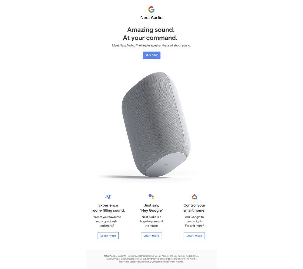 Great quality soundMeet the Google Nest Audio, a new smart speaker with all the things you love about Google Home, but with even better sound. The Nest Audio is designed to fill your room with crisp vocals and powerful bass thanks to the woofer, tweeter and tuning software. Nest Audio also adapts to your environment and what you're listening to, so your music, audiobooks and podcasts sound even clearer. You can even pair multiple speakers together. Pair two Nest Audio speakers for stereo sound, or dot them in different rooms so that your music can move around the house with you.Connect to your smart devicesNest Audio works with loads of compatible devices that are easy to set up in the Google Home app. You can ask Google to play songs, playlists, podcasts, and radio from popular streaming services. Or turn on the lights, set a timer or check the weather.The Google Nest Audio is designed to protect your privacy. You can delete your history by saying, “Hey Google, delete what I just said.” And if you want to turn off the microphones, simply slide the mic switch on the back to show orange.
