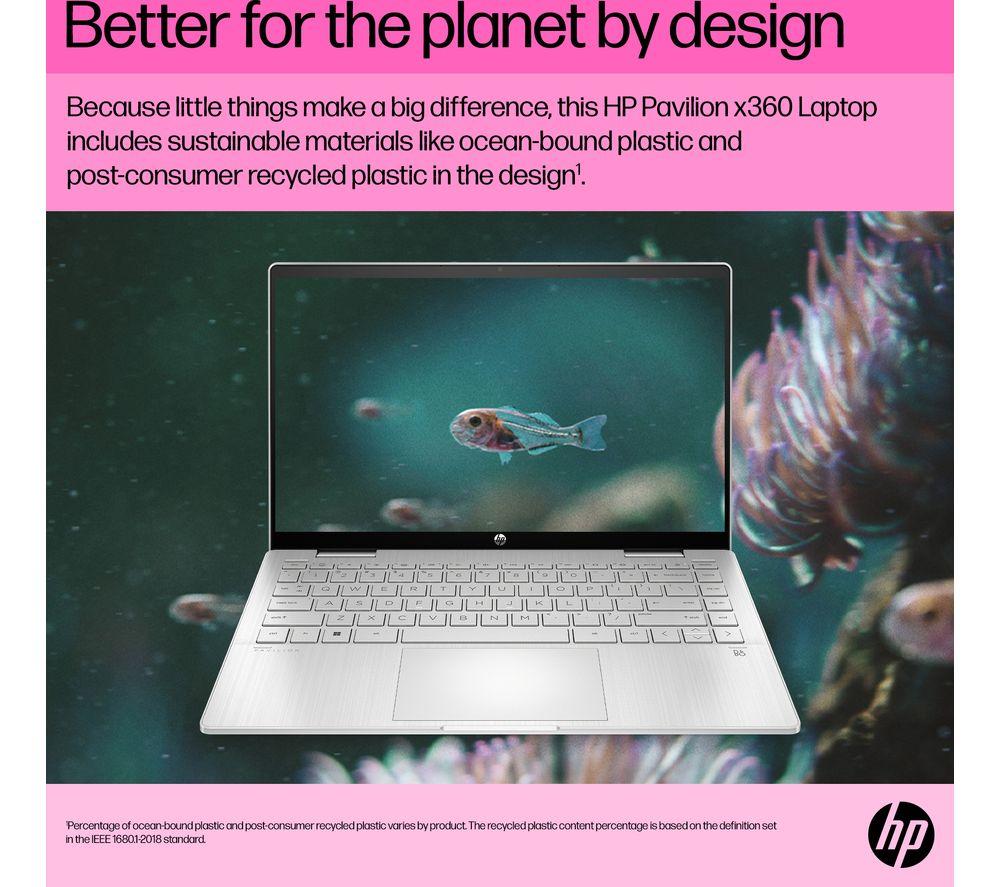 The Pavilion x360 wears many hats. In Laptop mode, it can take care of your everyday computing – browsing the web, edit Excel tables – that kind of stuff. The 13th gen Intel® Core i3 processor has plenty of power to keep things running smoothly. Flip it into Tent mode to watch a movie or run through a PowerPoint presentation on the Full HD touchscreen. Or get the keyboard out of the way and unleash your creativity in Tablet mode. Good to know - The USB Type-C port lets you charge the laptop, hook up a monitor or connect an external SSD - Need to get out of the door quickly? HP Fast Charge can get the laptop from 0 to 50% in 45 minutes - Look your best in virtual meetings with the HD Wide Vision webcam - The speakers are tuned by B&O, so your music and videos will sound great ___________________________________________________________________________ Intel, the Intel logo, Celeron, Intel Atom, Intel Core, Intel. Experience What's Inside, Intel Inside, the Intel Inside logo, Intel Unite, Iris, Pentium, Thunderbolt, the Thunderbolt logo, and Ultrabook are trademarks of Intel Corporation in the U.S. and/or other countries.