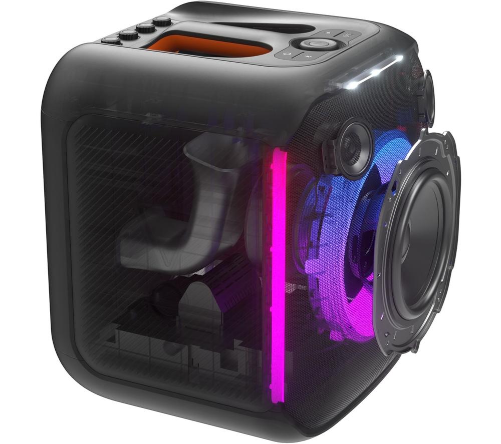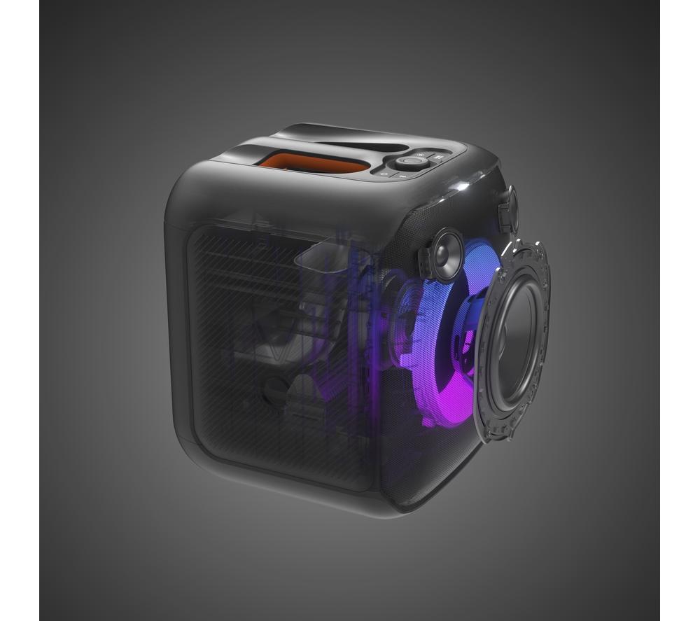 There's no party without some good music. Your favourite songs will sound better than ever thanks to the 2 levels of deep adjustable bass and JBL Original Pro Sound. Want to show off your talent? Grab the wireless mic and sing your heart out. And with dynamic LED lights that sync to the beat, you'll really get that club vibe. Good to know- Take the party outside - with an IPX4 splashproof rating you won't need to worry if there's a bit of rain- Customise colours, patterns, and update settings with the PartyBox app- Pair 2 speakers with True Wireless Stereo for even bigger sound- Up to 10 hours of battery life gives you enough juice to party till dawn- There's loads of connection options – choose from Bluetooth, USB or aux-in