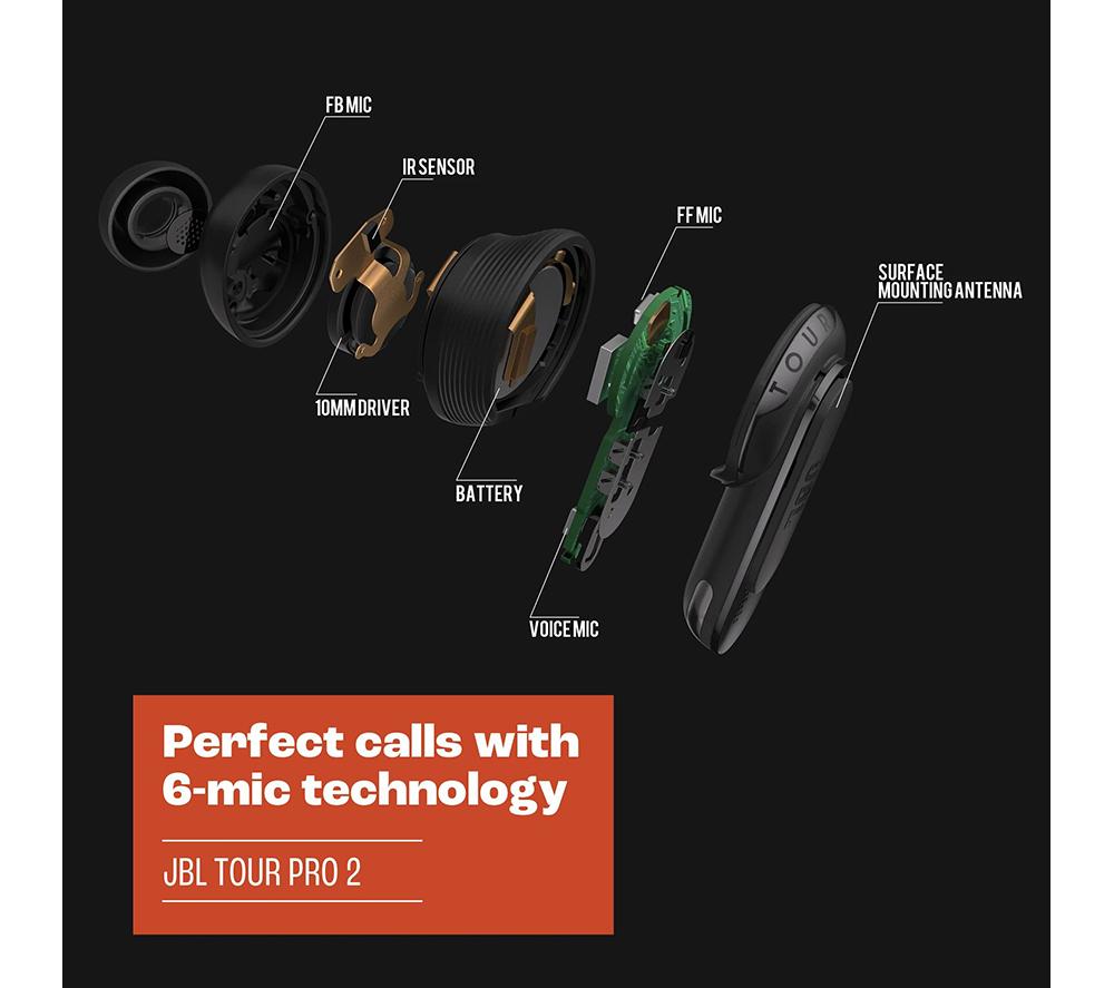 • Box contents :- JBL Tour Pro 2 Wireless Bluetooth Noise-Cancelling Earbuds- Case- USB Type-C cable- Ear tips x 3- User guide