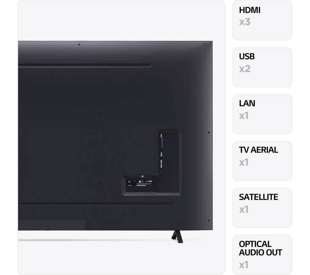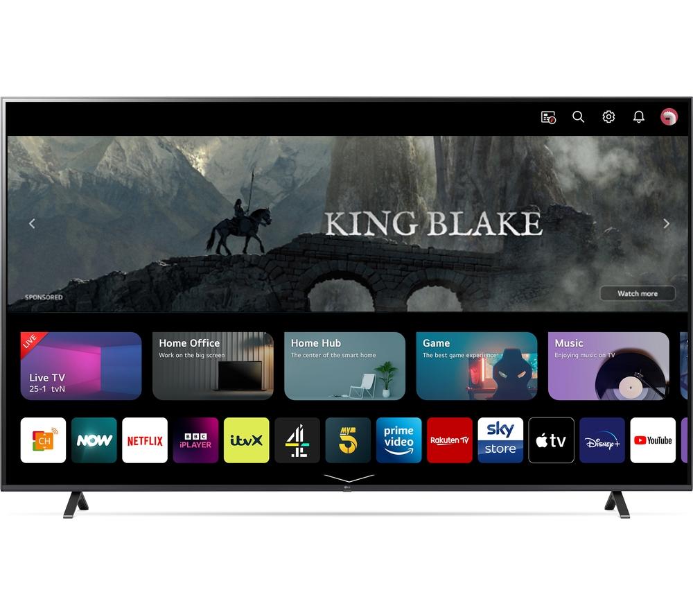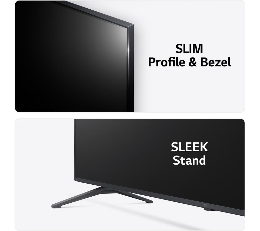 This LG UR78's 4K Ultra HD resolution means your favourite blockbusters look sharp and vibrant with incredible detail. Its High Dynamic Range (HDR) means more accurate colours, improved brightness levels and a deeper contrast. Those movie monsters just got a lot more menacing. With AI Sound, you'll feel the action all around you. It transforms 2-channel audio into virtual 5.1 surround sound for that movie theatre experience, only without the never-ending trailers. And Filmmaker Mode turns off any picture processing that can make movies look unnatural, so you can enjoy them the way the director intended.Good to know- Game Optimiser fine tunes your settings, so your games look and sound their best and run smoothly – your enemies don't stand a chance- Its modern, slim design will instantly become the focal point of your room and looks great on the wall or a TV cabinet- AI Acoustic Tuning uses the mic on your remote to tweak the TV's audio settings based on the size and shape of your room- Access all your favourite apps like Netflix, Prime Video, Disney+ and loads more via LG's webOS smart platform________________________________Please note: Some apps & services (including tuner) are only available in the UK. Apps & services may be removed or no longer supported by third party content providers at any time. Some apps & services may not be available at launch and may require a firmware update before becoming available. Some services require an account and/or subscription fee.