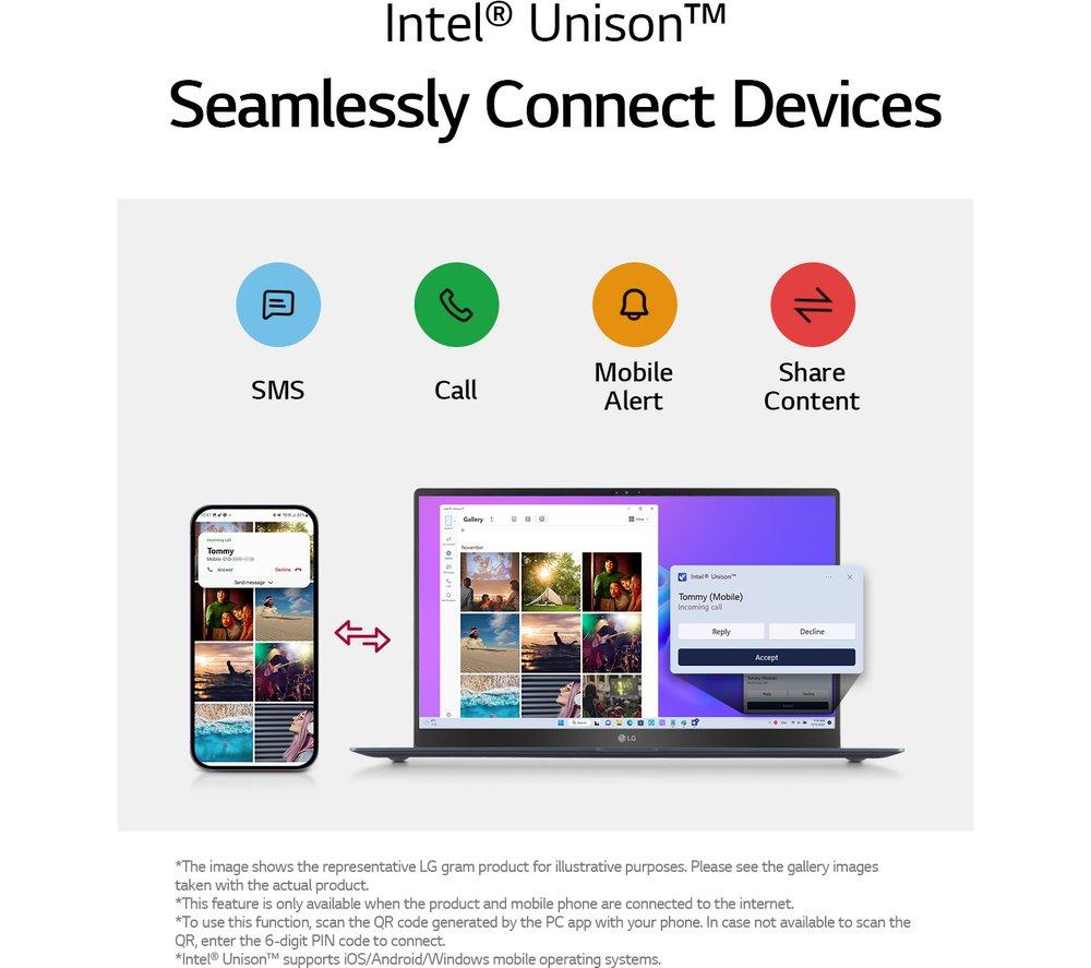 The LG gram SuperSlim is one lightweight heavy hitter that can give any workflow a knockout blow. It's packing a 13th Gen Intel® Core i7 that won't flinch at heavy-duty tasks. It's a great pick for content creation or streaming on the go because the OLED display is absolutely bursting with colour. And even though it weighs under 1 kg, it can take a punch. It's passed military-grade durability testing, so it can handle living in your backpack. As if it weren't perfect enough for digital nomads, the battery lasts up to 20 hours - longer than any flight. Good to know - Photo editors rejoice - the panel's 100% DCI-P3 cert means a wide colour gamut and True Black HDR 500 keeps it accurate - Mega Cooling 5.0 will chip in to keep your gram running smooth under heavy workloads - It comes with Dolby Atmos support, so you can get that 3D surround sound for total movie immersion - LG Glance brings tons of sensor tech to boost security, and can even use your gaze to move the cursor - Get set for remote working with a quality Full HD webcam, and sweet features like auto mute and a backlit keyboard - 16 GB of fast 6000 MHz DDR5 RAM is ready to take on serious multi-tasking - The 1 TB SSD drive is great if you want to store high-res pics and videos offline - Use the two Thunderbolt 4 ports and hook your LG up to dual 4K displays or an 8K panel __________________________________________________________________________ Intel, the Intel logo, Celeron, Intel Atom, Intel Core, Intel. Experience What's Inside, Intel Inside, the Intel Inside logo, Intel Unite, Iris, Pentium, Thunderbolt, the Thunderbolt logo, and Ultrabook are trademarks of Intel Corporation in the U.S. and/or other countries.
