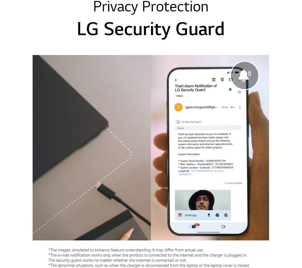 • Security features :- Facial recognition- Kensington security slot- Privacy alerts- Privacy guard- LG Glance