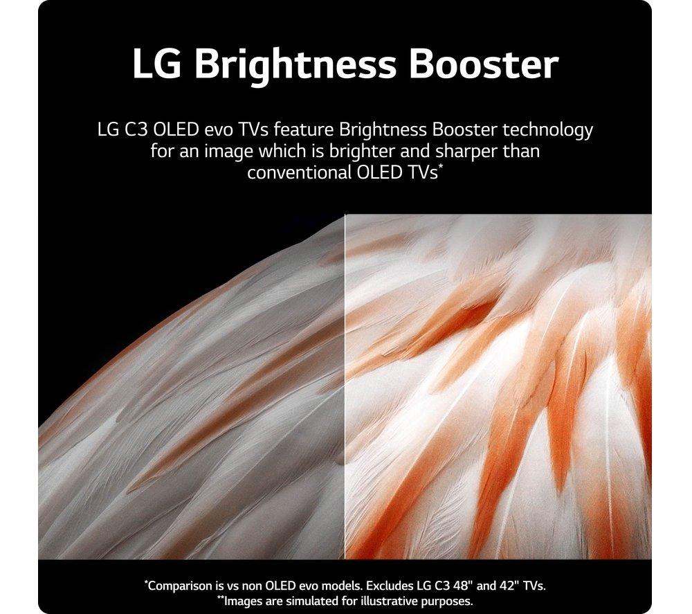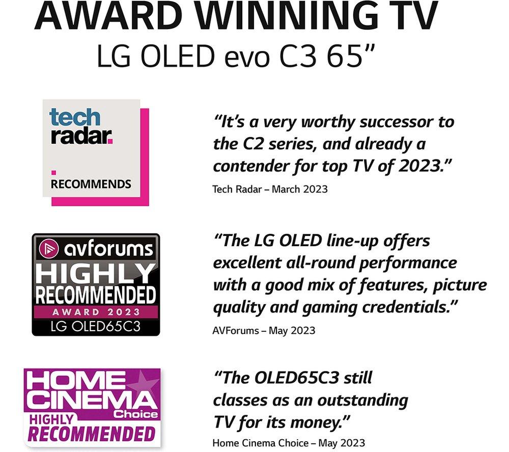 When was the last time your TV made you go ‘wow'? This LG C3 OLED TV uses self-lit pixels for perfect blacks and brilliant highlights – it's pretty magical. You'll be able to pick out every star in a night sky – and because there's no backlight, there's no annoying halos either. The a9 Gen6 AI processor is the brain of the TV. It's hard at work in the background, upscaling the picture and audio of everything you watch. More brightness means better contrast. You'll see more detail in every scene – day or night – thanks to the Brightness Booster.Good to know- It looks great in any room thanks to its stunningly thin and light design- There's something for the whole family on webOS, LG's smart platform which includes Netflix, Disney+ and a whole lot more- Filmmaker Mode turns off any picture processing that can make movies look unnatural, so you can enjoy them the way the director intended- Sound flows all around you with Dolby Atmos, making you feel like you're at the heart of the action- Dolby Vision HDR brings more depth to every scene with incredible contrast and vivid colours- Get the most out of your next-gen console with support for 4K@120 Hz and more gaming tech than you can shake a controller at- OLED Motion makes fast paced sports and movies look smooth, so it's easy to keep up with the action- AI Sound Pro transforms 2-channel audio into virtual 5.1 surround sound for that movie theatre experience________________________________Please note: Some apps & services (including tuner) are only available in the UK. Apps & services may be removed or no longer supported by third party content providers at any time. Some apps & services may not be available at launch and may require a firmware update before becoming available. Some services require an account and/or subscription fee.