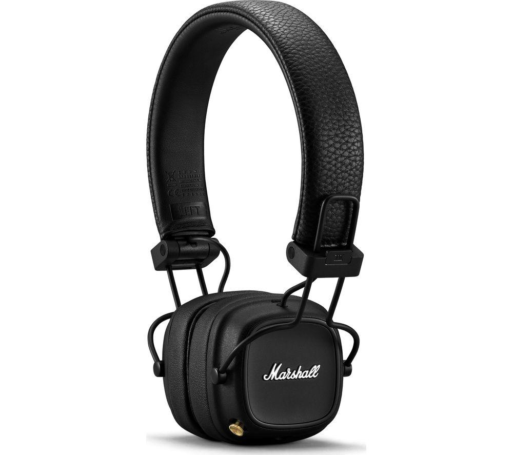 Iconic design Get lost in your music without the hassle of wires with the Marshall Major IV Wireless Bluetooth Headphones. With classic Marshall elements, such as the iconic logo and textured black vinyl, these headphones are stylish yet timeless.The ergonomic design means you can wear them comfortably for hours on end. Crisp audio experienceThe Major IV delivers enhanced bass response, smooth mids, and crystal-clear highs thanks to its custom tuned, dynamic drivers. The result is rich, detailed sound and the balance to suit any genre you listen to.Extended battery lifeWith up to 80 hours of playtime, they're built for the long haul. A quick 15 minute charge will give you up to 15 hours of battery life. You can now charge them wirelessly too (charging pad sold separately).Great for travel When you want to share your music with a friend, they can plug in their headphones into yours using a 3.5 mm jack. This way you can listen to the same music or watch the same movie on a plane.Leave your phone in your bag and use the headphones' multi-directional control knob to adjust the volume, skip tracks and more. When you're finished listening, simply fold the headphones and they're ready to be put away, with less chance of getting damaged.