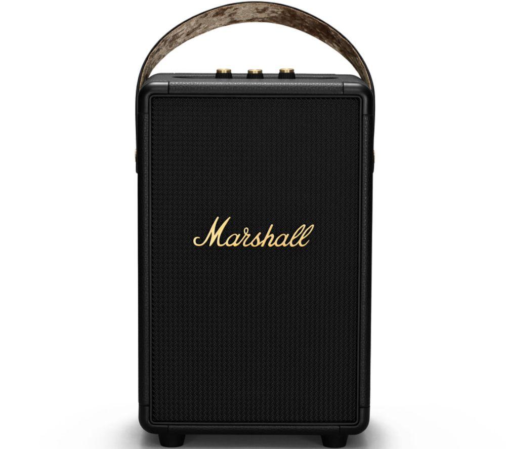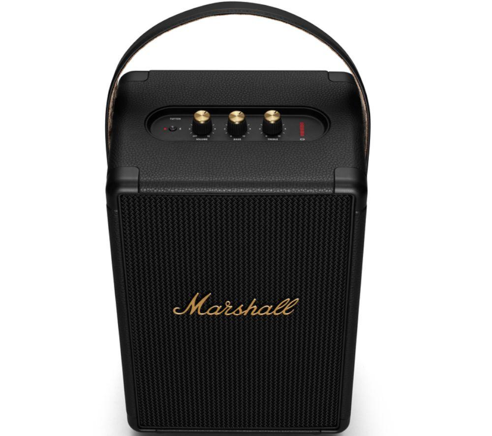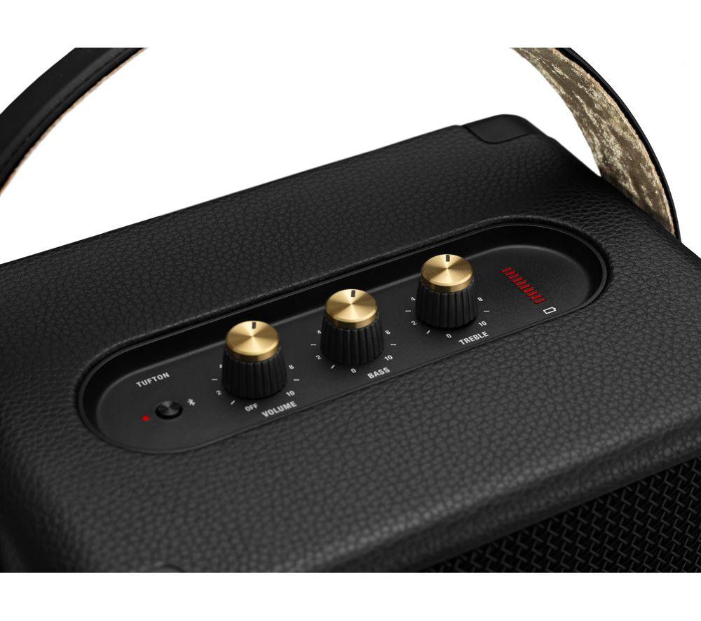 Party on the roadTake your tunes anywhere with the Marshall Tufton Portable Bluetooth Speaker. Party-proof and outdoor ready, it's made of durable materials and has an IPX2 water-resistance rating, meaning it'll cope with spills or light showers.Listen all day longEnjoy your music without worrying about charging. With up to 20 hours of playtime, you can listen all day. And it takes only 20 minutes to get an extra 3 hours, and a full charge in under 3 hours.\nBig sound\nThe Tufton uses a 3-way sound system of a tweeter, mid-range driver and subwoofer, so you'll get clear sound across all frequencies. The True Stereophonic technology gives you 360° multi-directional audio, so you can enjoy rich, balanced Marshall sound from any angle.\n\n\nEasy to control\n\nTaking turns choosing the tunes is easy. You can connect the Tufton to 2 different Bluetooth devices and enjoy different music libraries. There are control knobs on the panel, so you can tweak the bass, treble and volume to get the sound you desire.