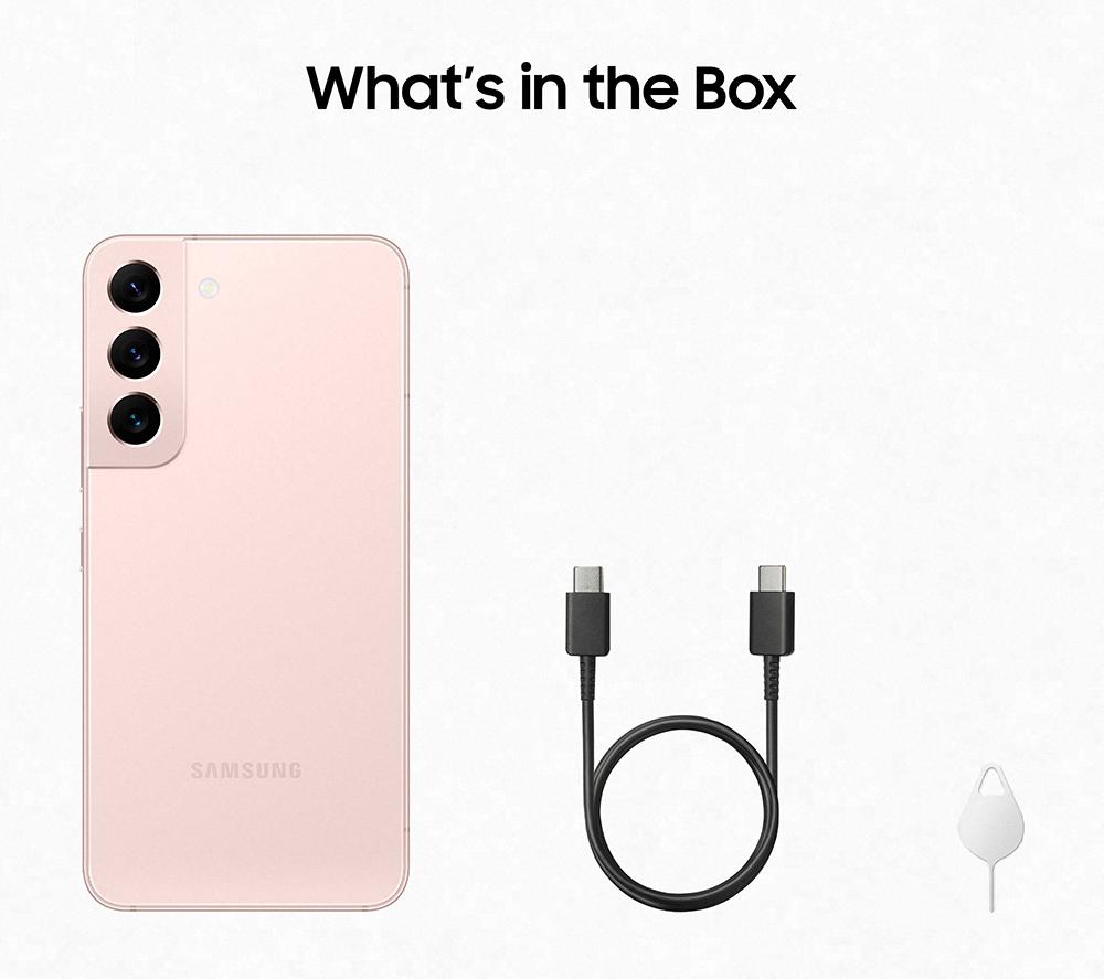 • Box contents :- Samsung Galaxy S22+ 5G- USB-C charging cable- Quick start guide- Warranty card- Ejection pin