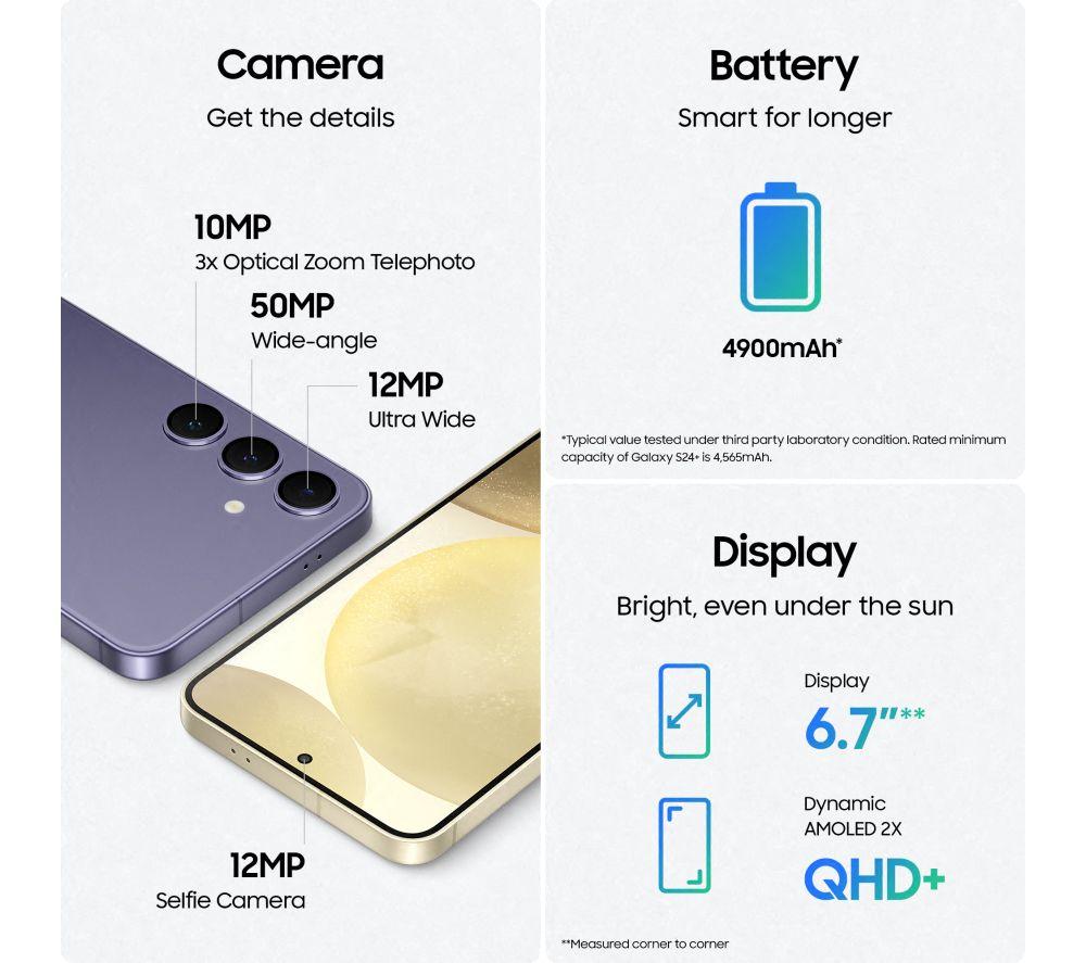 The Galaxy S24+ is one impressive bit of hardware. A 50 MP camera, AMOLED display, blazing-fast chip – the works. But what makes it truly special is the power of AI. It's at your service 24/7 to help with everything from small things to the big tasks. Need to make a phone call in another language? Tranquillo – Live Translate's got you. Writing an email to your boss but you can't nail that professional tone? Chat Assist will suggest the perfect business-friendly phrases as you type. Who's got time to read a whole news article these days? Note Assist spits out a bite-sized summary in seconds. But it's not just about productivity. The cameras get an AI overhaul, too. Combine the 50 MP camera with Nitography AI and voila. The dark has never looked so bright. It doesn't even matter if somebody photobombed you. Photo Assist gets rid of them with a single tap. Gone! The powerhouse behind this magic is Samsung's Exynos 2400 processor. It'll run your games at silky-smooth framerates with beautifully realistic graphics. And thanks to the massive 4900 mAh battery, it barely even needs charging breaks.Good to know- Whether you're browsing or binging - the 6.7\