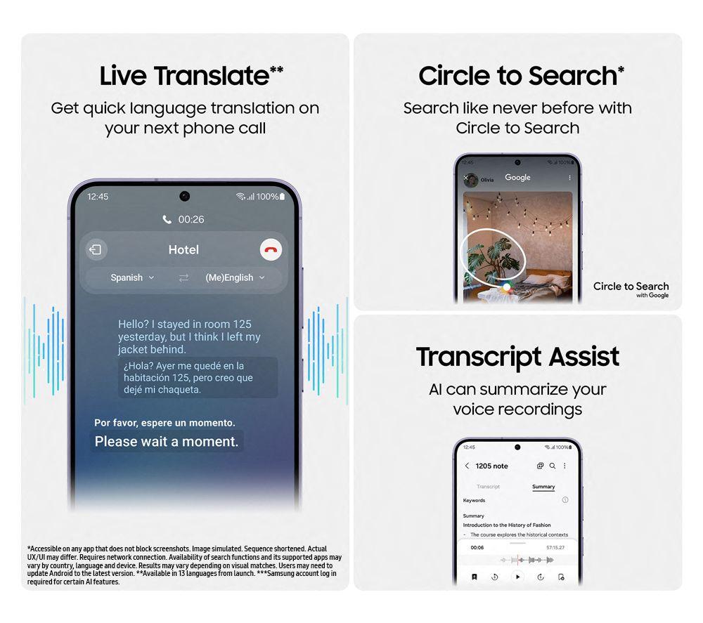 • Connectivity features :- Circle to Search with Google- Live Translate- Chat Assist- Note Assist- Photo Assist- Transcript Assist- Browsing Assist- Screen mirroring- Samsung Pay- Nearby Share- Music Share- Dex compatible