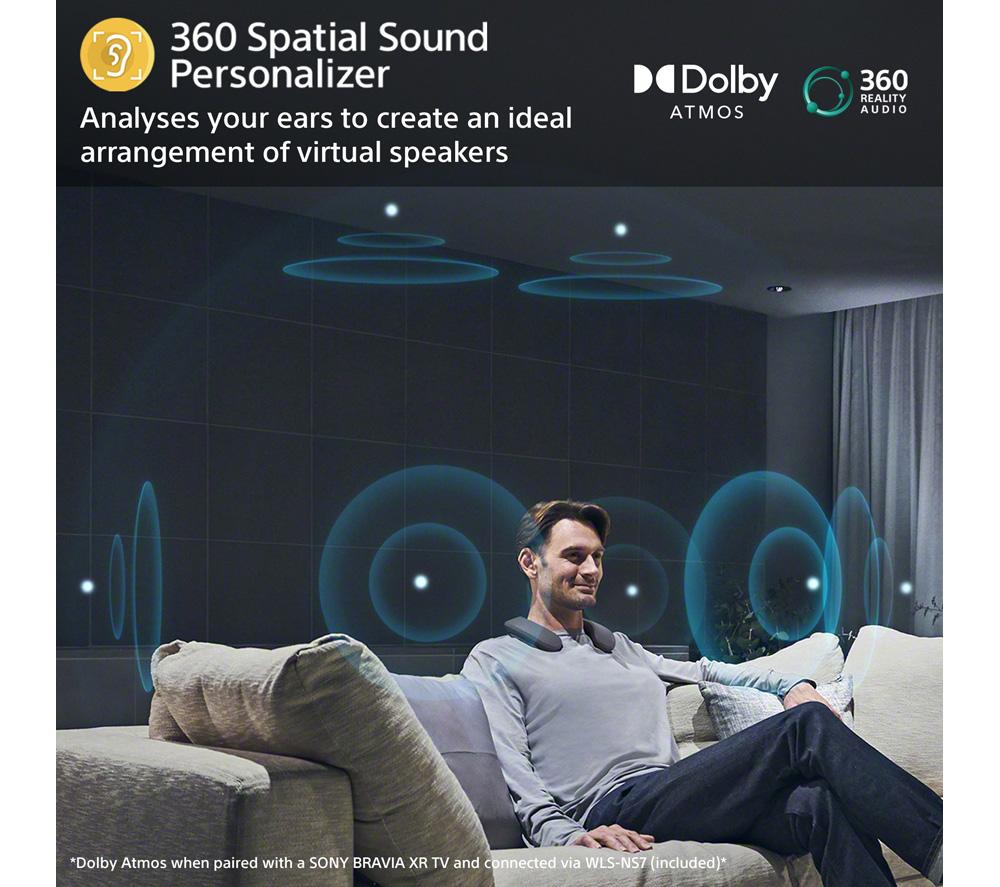 Enjoy personal cinematic experience with immersive audio, without the discomfort of headphones or booming speakers resonating throughout your home. The Sony SRS-NS7 Neckband Speaker surrounds your head with 360 Spatial Sound. What we love - Connect the transmitter to your Sony Bravia XR TV, pair with the neckband speaker wirelessly via Bluetooth and enjoy surround sound with Dolby Atmos perfectly matching what you're watching - Use the 360 Spatial Sound Personalizer app to capture and analyse your ear shape, the sound will be adjusted to get the best surround sound just for you Good to know - With IPX4 certification, you don't need to worry about sweating or spilling your drink - Roam free with 12-hours battery life and when you run out, you can get another hour from 10 minutes of charging - You can also pair with your smartphone, tablet or laptop to listen to music with compatible apps and even take calls with the built-in microphone