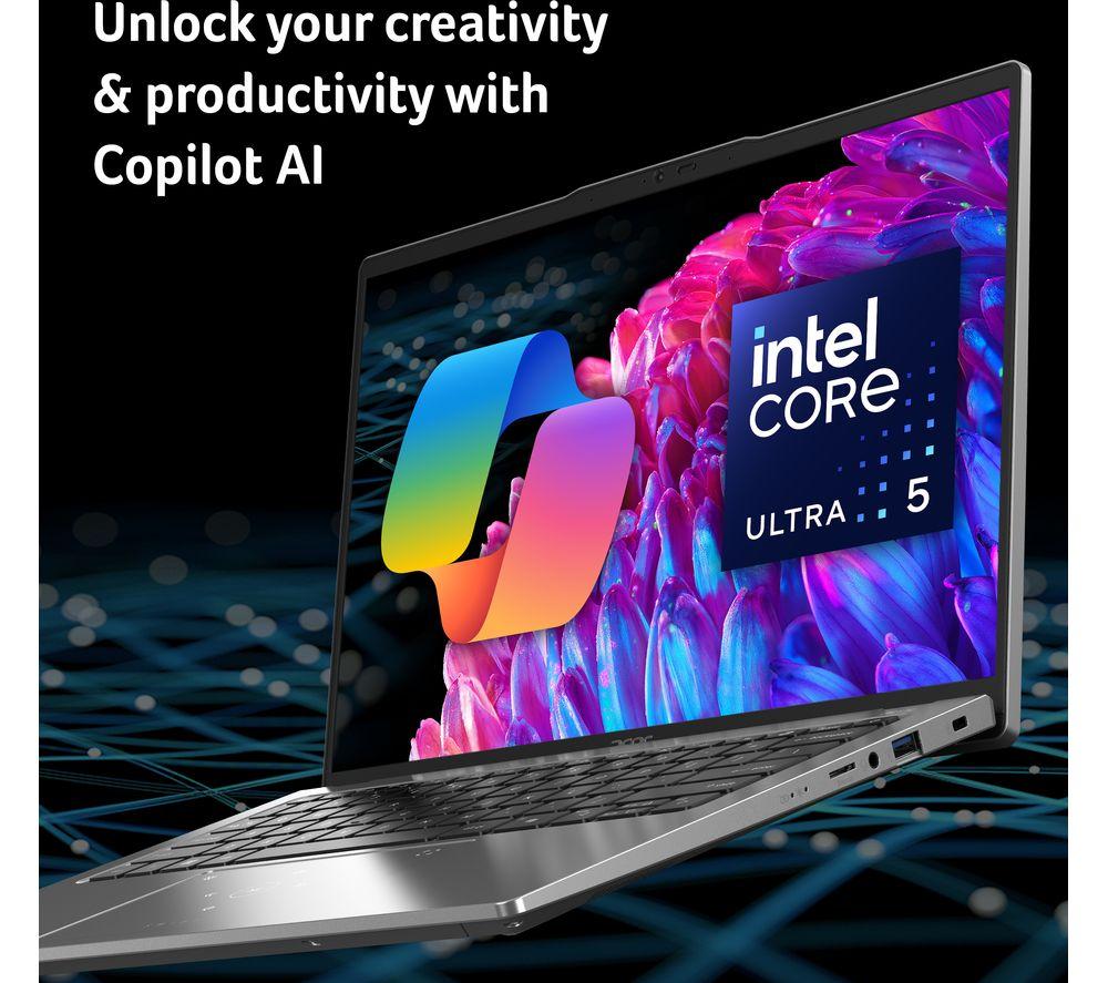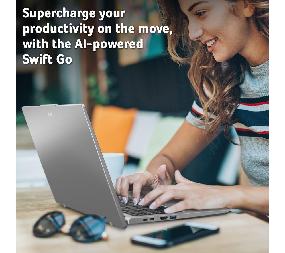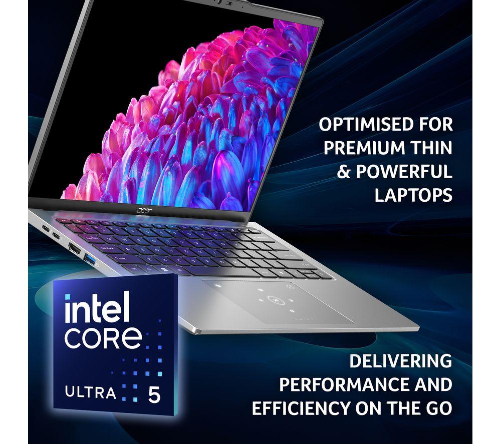At just 1.32 Kg, you'd never guess how much potential is hiding in the Acer Swift Go. That's because the Intel® Core Ultra 5 processor isn't just powerful, it's super efficient, too. The apps your use and tabs you have open don't stand a chance against its 12 cores. And when it's time to take a break and watch a movie, you're in for a treat. The 2.8K OLED display is full of contrast, colour and detail. It makes even spreadsheets look good. And with battery life up to 11.5 hours, you don't even need to waste space in your bag on a charger. Good to know - The OLED screen's got a 90 Hz refresh rate for perfectly smooth motion - You can get up to some creative work or light gaming thanks to Intel® Iris® Xe graphics - With 16 GB of DDR5 RAM you can multitask like you've never multitasked before - The Quad HD webcam will make you look great on work calls and catchups with friends - Browse, stream and download faster than ever before thanks to WiFi 6E - You can hook up monitors, transfer data or charge the laptop using the Thunderbolt 4 port - No more typing out passwords – the fingerprint reader is much more convenient - The Intel® Evo platform brings together premium technologies for an exceptional performance ___________________________________________________________________________ Intel, the Intel logo, Celeron, Intel Atom, Intel Core, Intel. Experience What's Inside, Intel Inside, the Intel Inside logo, Intel Unite, Iris, Pentium, Thunderbolt, the Thunderbolt logo, and Ultrabook are trademarks of Intel Corporation in the U.S. and/or other countries.