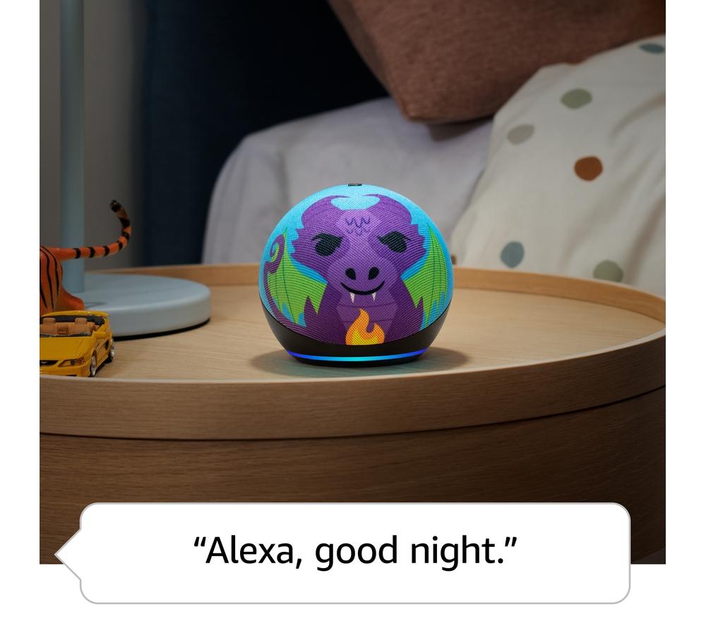 Learning just got a whole lot more fun. Made with little ones in mind, the Amazon Echo Dot Kids has a funky design, kid-friendly content, and most importantly – parental controls. They can ask Alexa, the built-in voice assistant, questions like “Alexa, what sound does a tiger make?” or “Alexa, how far away is the moon?”. Handy when they get stuck on a homework question – or are just feeling curious. This 5th gen speaker is the same dinky size as the 4th gen, but Amazon have packed in a larger driver, so it sounds louder than ever. Perfect for streaming music, listening to a bedtime story, or playing interactive games. They can take charge of their routines as they grow more independent too. Alexa can help them set their own alarms, switch off smart lights, and call (parent-approved) friends and family.Good to know- Includes 1 year of Amazon Kids+ which offers kid-friendly Audible books, interactive games and educational skills from characters they love- Alexa will automatically give kid-friendly responses and filter out songs with explicit lyrics- The Amazon Parent Dashboard lets you set daily time limits, review activity, and filter content for up to 4 children's profiles- Personalise your family's Alexa Privacy settings on the app – there's a mic-off button too- You can send messages to other Echo speakers around the house, so you can remind them it's dinner time - It's super simple to setup – just plug in and use the Alexa app to connect to WiFi and create a kids profile- As part of a drive to reduce waste, 55% of the plastic parts and 95% of the fabric used is from post-consumer recycled materials____________________________________Please note: Includes 1 year of Amazon Kids+, a digital subscription designed for kids aged 3–12. After 1 year, your subscription will automatically renew every month starting at just £3.99/month. You may cancel at any time by visiting the Amazon Parent Dashboard or contacting Amazon Customer Service.
