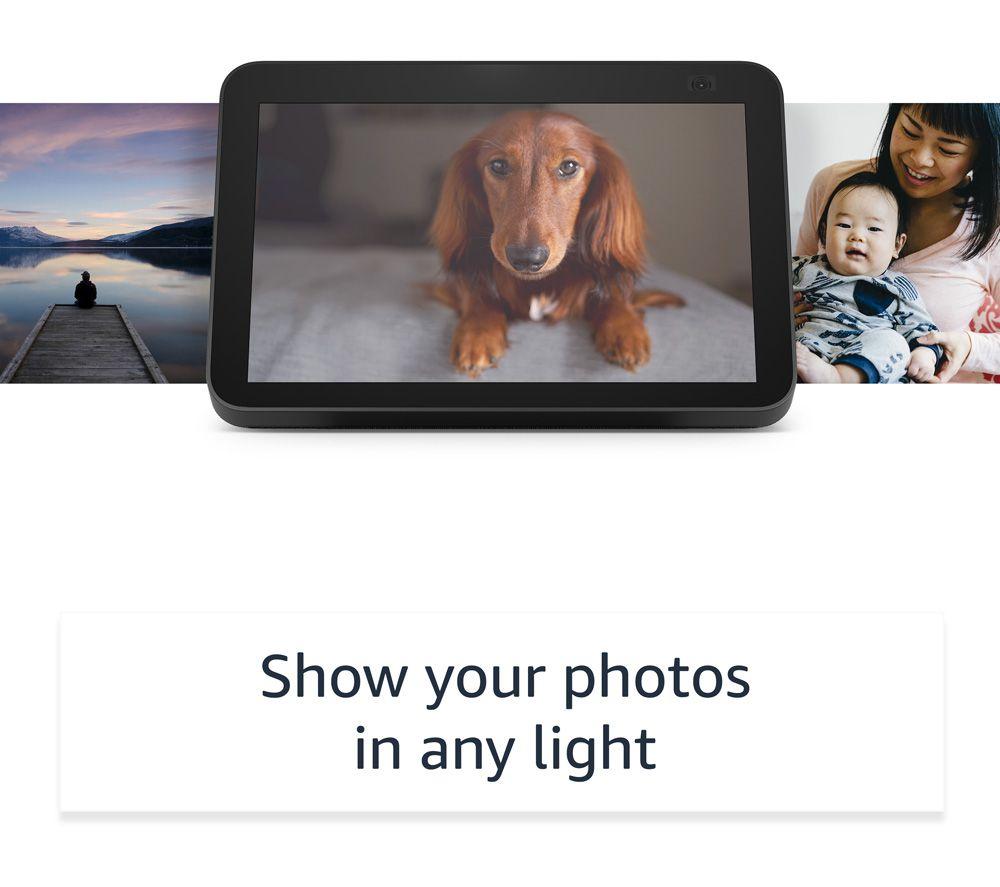 See more and do more with Amazon's 2nd Gen Echo Show 8. Alexa voice assistant is built-in, so all you need to do is ask. The 8” HD touchscreen comes in oh so handy for video chats. Family and friends (with an Echo device or the Alexa app) will be able to see you clearly with the 13 MP camera and auto-framing to keep you in the centre. Simply ask Alexa to call your contacts. You can also securely access the built-in camera to check your home when you're away. Someone at the front door? It works with lots of smart doorbells and cameras, so you can see who's calling. And when you want to be entertained—you guessed it! Ask Alexa to play TV shows or films from Prime Video, Netflix and more, or music from Amazon Music, Spotify, and others.Good to know- Alexa is great for everyday stuff like reminders, timers, shopping lists, recipes, and news and weather updates- It can be paired with other Echo devices for multi-room music- Alexa has tens of thousands of skills and counting - just say “Alexa, help me get started with skills”- You can display photos from Amazon Photos or Facebook on the home screen- Personalise your Alexa Privacy settings on the app or by asking Alexa – there's a mic-off button and built-in camera cover too- Parental controls make it safe for the whole family to use – little ones can learn and have fun with Amazon Kids+ (subscription required)- It's super simple to set up – just plug in and use the Alexa app to connect to WiFi and get started- Designed with sustainability in mind, it's made from 30% post-consumer recycled plastics, 100% post-consumer recycled fabric, and 100% recycled die-cast aluminium