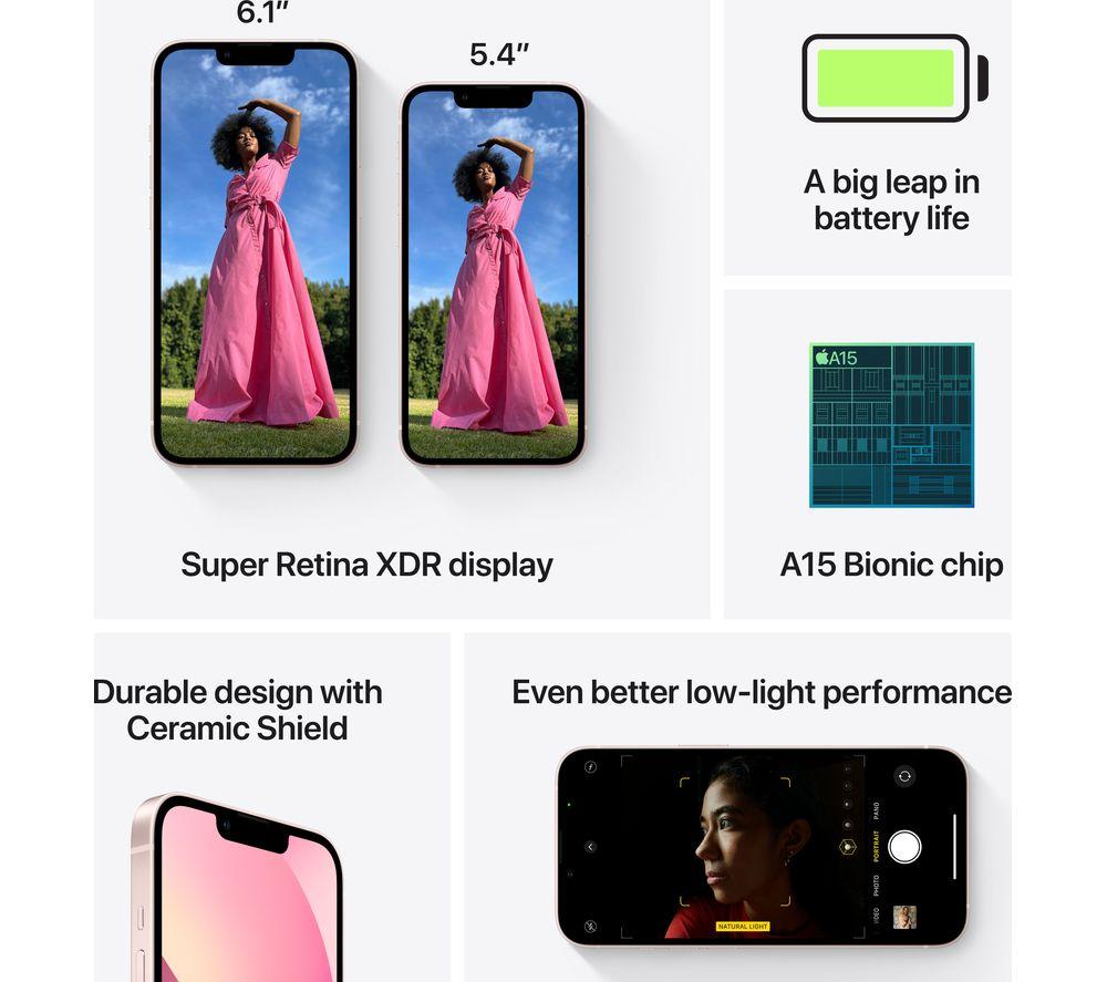 Apple iPhone 13 and its A15 bionic chip are ready for anything – apps, games, even video editing. Which is handy because you'll get great 4K video from the 12 MP dual camera system. It even has an ultra-wide lens so you can fit the whole family in your holiday snaps! And whether you're flicking through memories or binging on Apple TV, everything will look awesome on the 6.1\